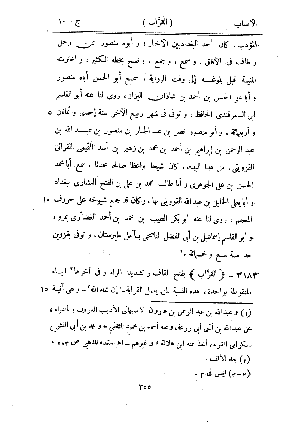 المؤدب، كان أحد البغداديين الأخيار، وأبوه منصور ممن رحل وطاف في الآفاق، وسمع، وجمع، ونسخ بخطه الكثير، واخترمته المنية قبل بلوغه إلى وقت الرواية. سمع أبو الحسن أباه منصور وأبا على الحسن بن أحمد بن شاذان البزاز، روى لنا عنه أبو القاسم ابن السمرقندي الحافظ، وتوفى في شهر ربيع الآخر سنة إحدى وثمانين وأربعمائة وأبو منصور نصر بن عبد الجبار بن منصور بن عبد الله بن عبد الرحمن بن إبراهيم بن أحمد بن محمد بن زهير بن أسد التميمي القرائي القزويني، من هذا البيت، كان شيخا واعظا صالحا محدثا، سمع أبا محمد الحسن بن على الجوهري وأبا طالب محمد بن على بن الفتح العشاري ببغداد وأبا يعلى الخليل بن عبد الله القزويني بها، وكان قد جمع شيوخه على حروف المعجم، روى لنا عنه أبو بكر الطيب بن محمد بن أحمد الغضائري بمرو، وأبو القاسم إسماعيل بن أبى الفضل الناصحى بآمل طبرستان، وتوفى بقزوين بعد سنة سبع وخمسمائة. [1]