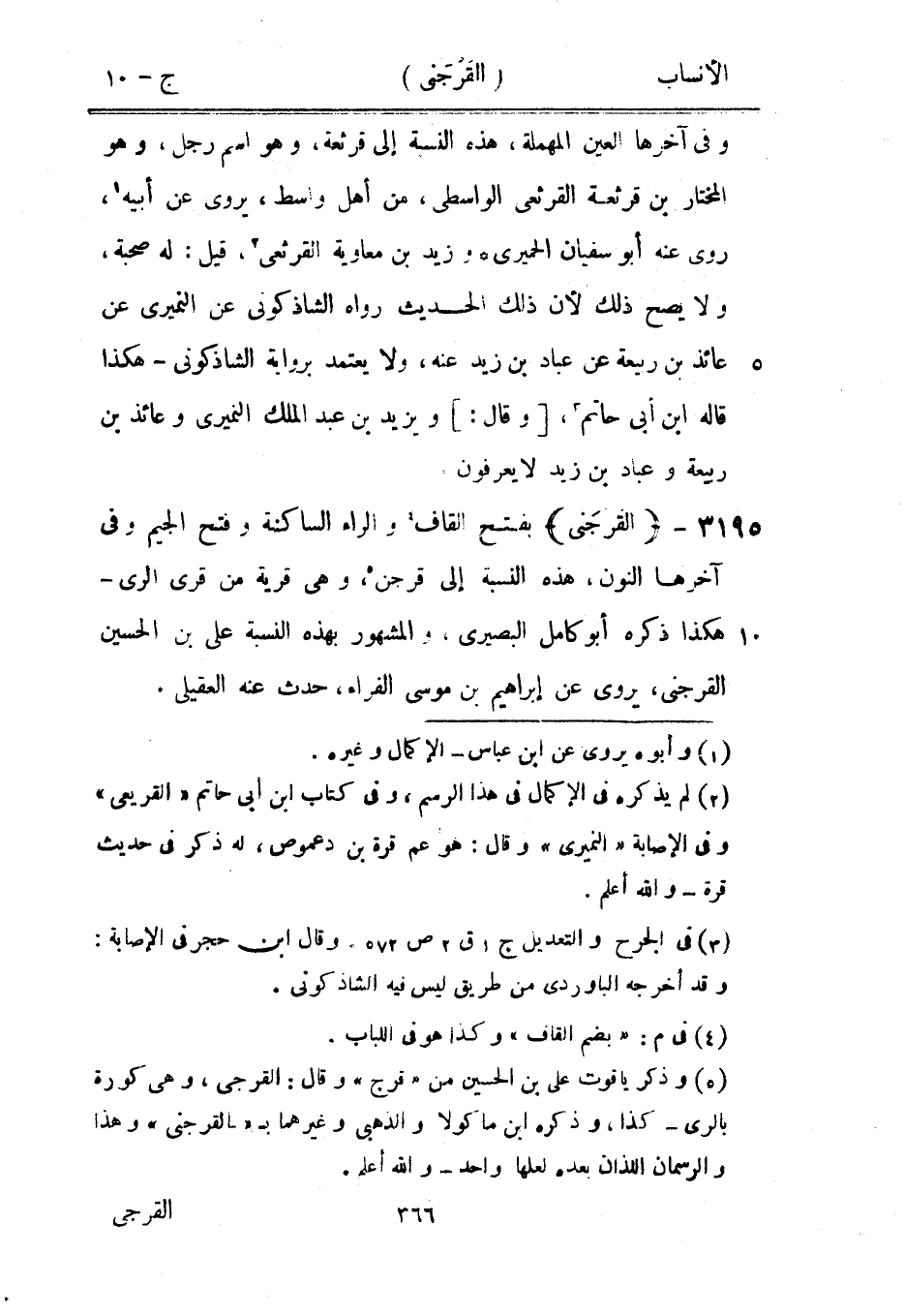 [5] وذكر ياقوت على بن الحسين من «قرج» وقال: القرجى، وهي كورة بالري- كذا، وذكره ابن ماكولا والذهبي وغيرهما ب «- القرجنى» وهذا والرسمان اللذان بعده لعلها واحد- والله أعلم.