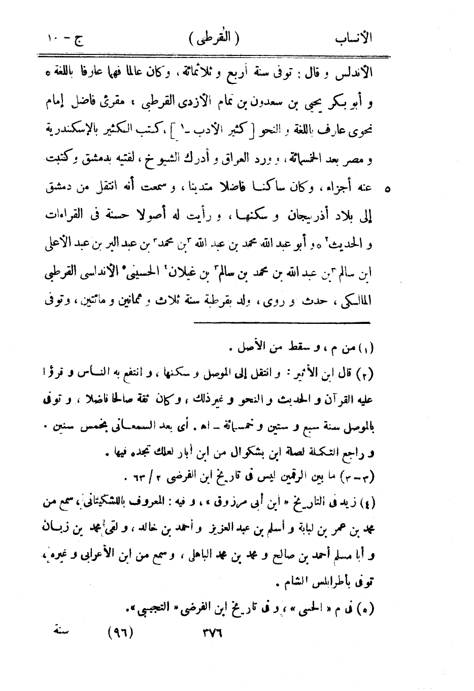 الأندلس وقال: توفى سنة أربع وثلاثمائة، وكان عالما فهما عارفا باللغة وأبو بكر يحيى بن سعدون بن تمام الأزدي القرطبي، مقرئ فاضل إمام نحوي عارف باللغة والنحو [كثير الأدب-[1]] ، كتب الكثير بالإسكندرية ومصر بعد الخمسمائة، وورد العراق وأدرك الشيوخ، لقيته بدمشق وكتبت عنه أجزاء، وكان ساكنا فاضلا متدينا، وسمعت أنه انتقل من دمشق إلى بلاد أذربيجان وسكنها، ورأيت له أصولا حسنة في القراءات والحديث [2] وأبو عبد الله محمد بن عبد الله [3] بن محمد [3] بن عبد البر بن عبد الأعلى ابن سالم [3] بن عبد الله بن محمد بن سالم [3] بن غيلان [4] الحسيني [5] الأندلسى القرطبي المالكي، حدث وروى، ولد بقرطبة سنة ثلاث وثمانين ومائتين، وتوفى