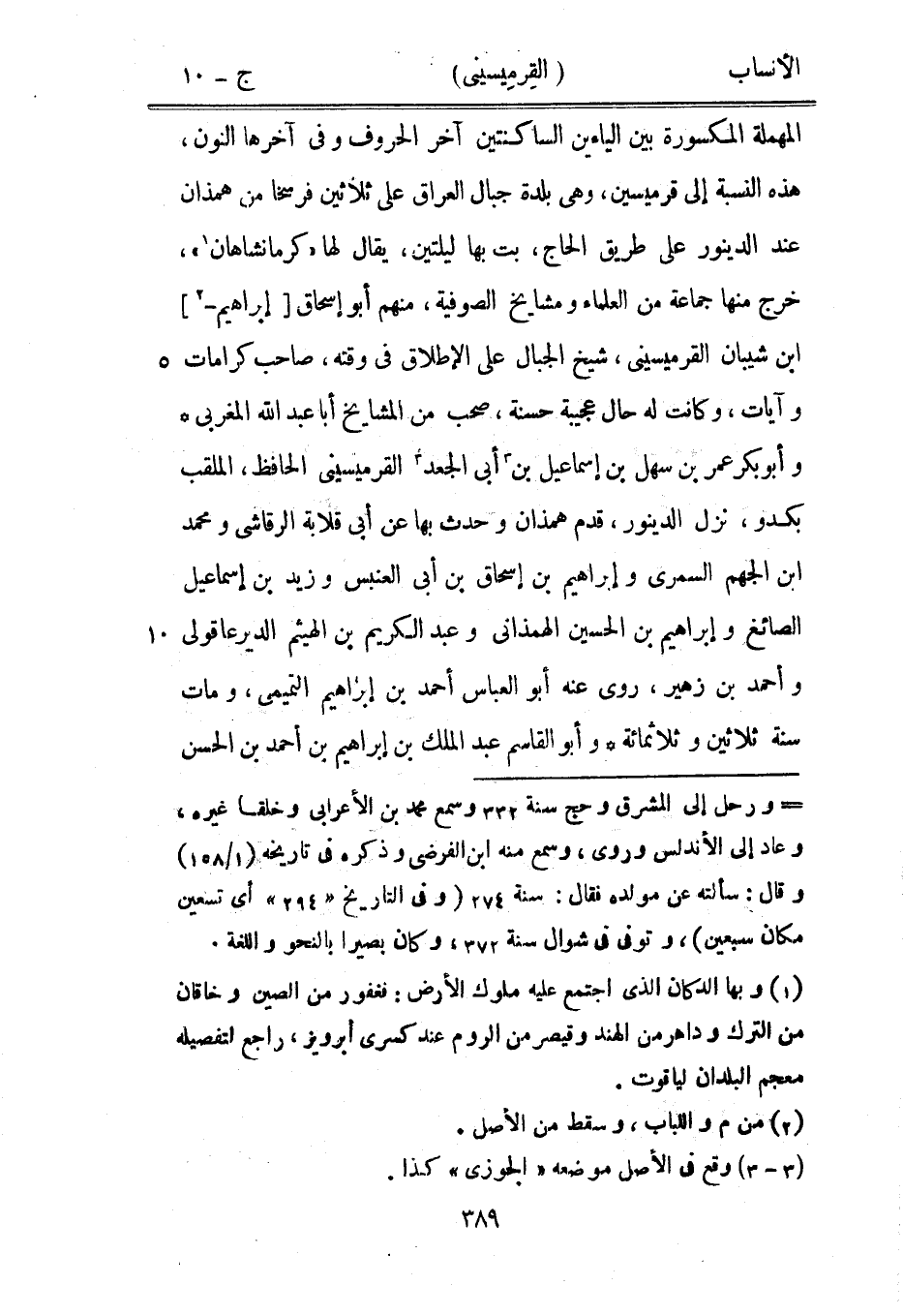 المهملة المكسورة بين الياءين الساكنتين آخر الحروف وفي آخرها النون، هذه النسبة إلى قرميسين، وهي بلدة جبال العراق على ثلاثين فرسخا من همذان عند الدينور على طريق الحاج، بت بها ليلتين، يقال لها «كرمانشاهان [1] » ، خرج منها جماعة من العلماء ومشايخ الصوفية، منهم أبو إسحاق [إبراهيم-[2]] ابن شيبان القرميسيني، شيخ الجبال على الإطلاق في وقته، صاحب كرامات وآيات، وكانت له حال عجيبة حسنة، صحب من المشايخ أبا عبد الله المغربي وأبو بكر عمر بن سهل بن إسماعيل بن [3] أبى الجعد [3] القرميسيني الحافظ، الملقب بكدو، نزل الدينور، قدم همذان وحدث بها عن أبى قلابة الرقاشيّ ومحمد ابن الجهم السمري وإبراهيم بن إسحاق بن أبى العنبس وزيد بن إسماعيل الصائغ وإبراهيم بن الحسين الهمذانيّ وعبد الكريم بن الهيثم الديرعاقولي وأحمد بن زهير، روى عنه أبو العباس أحمد بن إبراهيم التميمي، ومات سنة ثلاثين وثلاثمائة وأبو القاسم عبد الملك بن إبراهيم بن أحمد بن الحسن