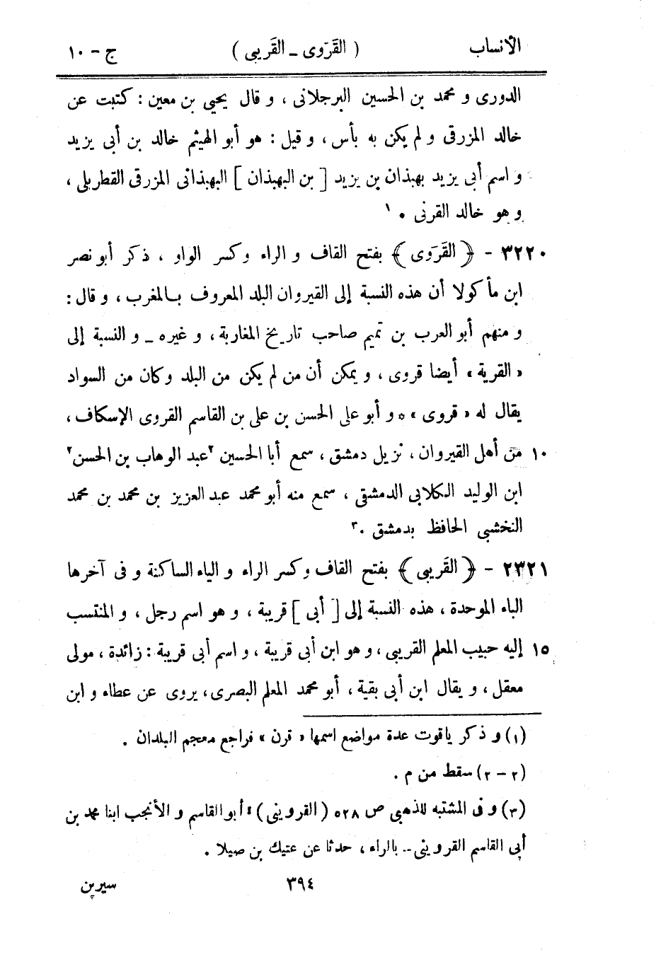 ومنهم أبو العرب بن تميم صاحب تاريخ المغاربة، وغيره- والنسبة إلى «القرية» أيضا قروي، ويمكن أن من لم يكن من البلد وكان من السواد يقال له «قروي» وأبو على الحسن بن على بن القاسم القروي الإسكاف، من أهل القيروان، نزيل دمشق، سمع أبا الحسين [2] عبد الوهاب بن الحسن [2] ابن الوليد الكلابي الدمشقيّ، سمع منه أبو محمد عبد العزيز بن محمد بن محمد النخشبى الحافظ بدمشق. [3]