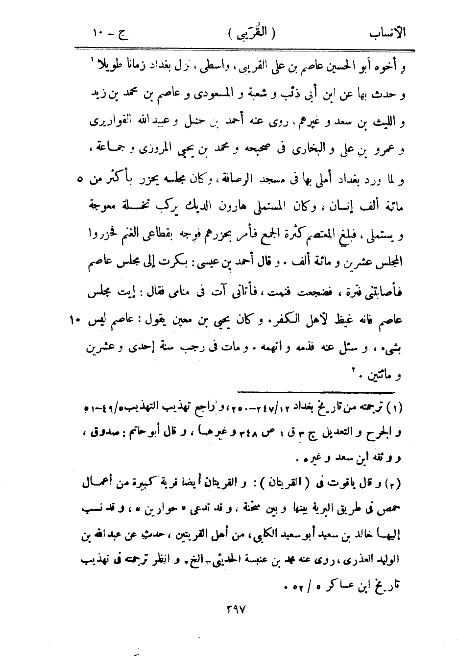 [1] ترجمته من تاريخ بغداد 12/ 247- 250، وراجع تهذيب التهذيب 5/ 49- 51 والجرح والتعديل ج 3 ق 1 ص 348 وغيرها، وقال أبو حاتم: صدوق، ووثقه ابن سعد وغيره.