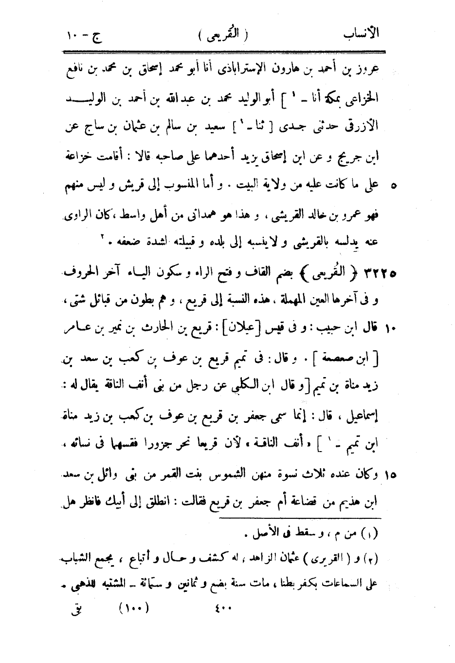بضم القاف وفتح الراء وسكون الياء آخر الحروف وفي آخرها العين المهملة، هذه النسبة إلى قريع، وهم بطون من قبائل شتى، قال ابن حبيب: وفي قيس [عيلان] : قريع بن الحارث بن نمير بن عامر [ابن صعصعة] . وقال: في تميم قريع بن عوف بن كعب بن سعد بن زيد مناة بن تميم [وقال ابن الكلبي عن رجل من بنى أنف الناقة يقال له: