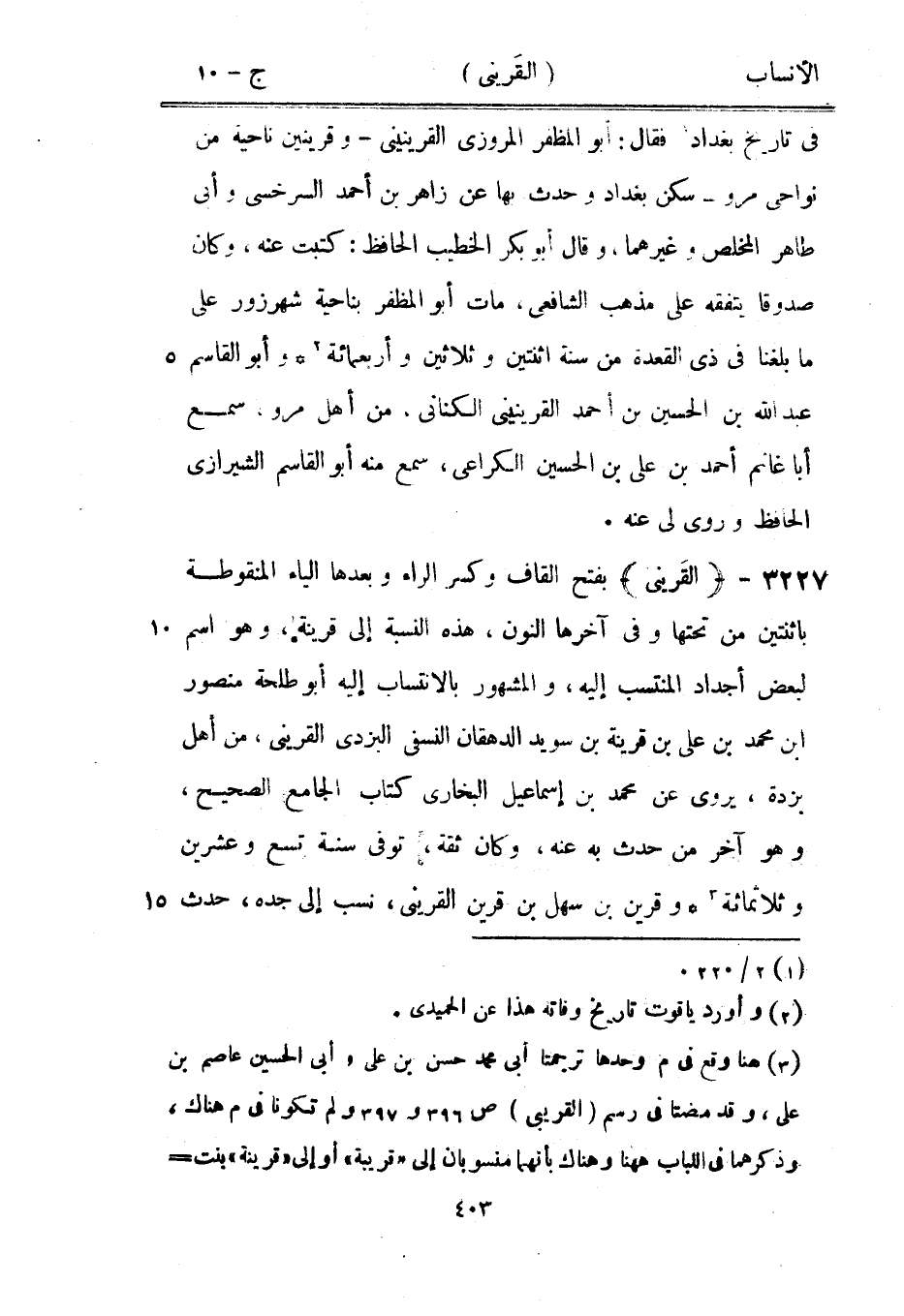 بفتح القاف وكسر الراء وبعدها الياء المنقوطة باثنتين من تحتها وفي آخرها النون، هذه النسبة إلى قرينة، وهو اسم لبعض أجداد المنتسب إليه، والمشهور بالانتساب إليه أبو طلحة منصور ابن محمد بن على بن قرينة بن سويد الدهقان النسفي البزدي القريني، من أهل بزدة، يروى عن محمد بن إسماعيل البخاري كتاب الجامع الصحيح، وهو آخر من حدث به عنه، وكان ثقة، توفى سنة تسع وعشرين وثلاثمائة [3] وقرين بن سهل بن قرين القريني، نسب إلى جده، حدث