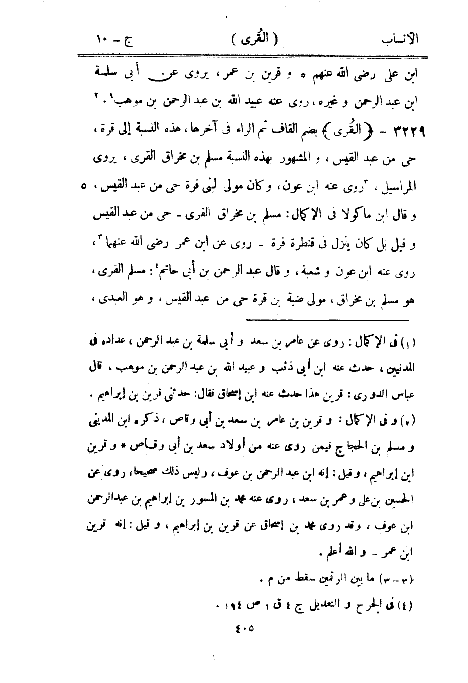 بضم القاف ثم الراء في آخرها، هذه النسبة إلى قرة، حي من عبد القيس، والمشهور بهذه النسبة مسلم بن مخراق القرى، يروى المراسيل، [3] روى عنه ابن عون، وكان مولى لبني قرة حي من عبد القيس، وقال ابن ماكولا في الإكمال: مسلم بن مخراق القرى- حي من عبد القيس وقيل بل كان ينزل في قنطرة قرة- روى عن ابن عمر رضى الله عنهما [3] ، روى عنه ابن عون وشعبة، وقال عبد الرحمن بن أبى حاتم [4] : مسلم القرى، هو مسلم بن مخراق، مولى ضبة بن قرة حي من عبد القيس، وهو العبديّ،