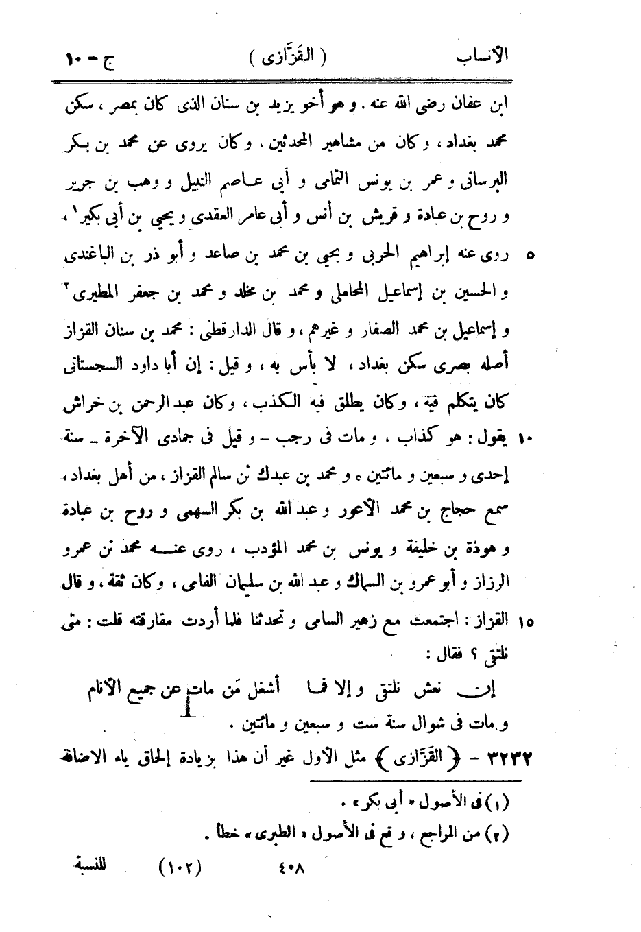 ابن عفان رضى الله عنه، وهو أخو يزيد بن سنان الّذي كان بمصر، سكن محمد بغداد، وكان من مشاهير المحدثين، وكان يروى عن محمد بن بكر البرساني وعمر بن يونس التمامى وأبى عاصم النبيل ووهب بن جرير وروح بن عبادة وقريش بن أنس وأبى عامر العقدي ويحيى بن أبى بكير [1] ، روى عنه إبراهيم الحربي ويحيى بن محمد بن صاعد وأبو ذر بن الباغندي والحسين بن إسماعيل المحاملي ومحمد بن مخلد ومحمد بن جعفر المطيري [2] وإسماعيل بن محمد الصفار وغيرهم، وقال الدار قطنى: محمد بن سنان القزاز أصله بصرى سكن بغداد، لا بأس به، وقيل: إن أبا داود السجستاني كان يتكلم فيه، وكان يطلق فيه الكذب، وكان عبد الرحمن بن خراش يقول: هو كذاب، ومات في رجب- وقيل في جمادى الآخرة- سنة إحدى وسبعين ومائتين ومحمد بن عبدك بن سالم القزاز، من أهل بغداد، سمع حجاج بن محمد الأعور وعبد الله بن بكر السهمي وروح بن عبادة وهوذة بن خليفة ويونس بن محمد المؤدب، روى عنه محمد بن عمرو الرزاز وأبو عمرو بن السماك وعبد الله بن سليمان الفامي، وكان ثقة، وقال القزاز: اجتمعت مع زهير السامي وتحدثنا فلما أردت مقارقته قلت: متى نلتقي؟ فقال: