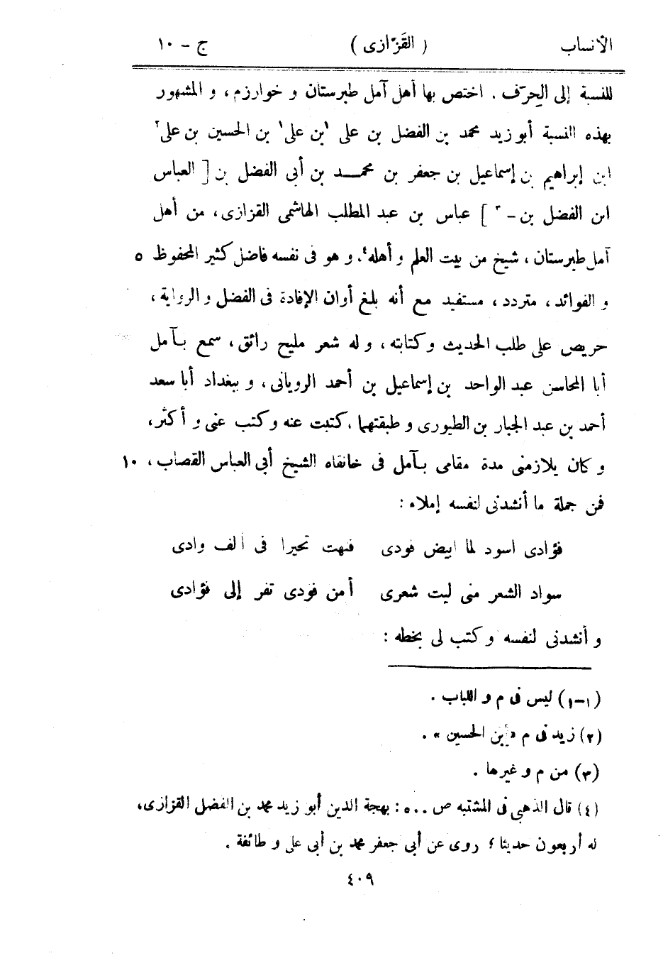 للنسبة إلى الحرف، اختص بها أهل آمل طبرستان وخوارزم، والمشهور بهذه النسبة أبو زيد محمد بن الفضل بن على [1] بن على [1] بن الحسين بن على [2] ابن إبراهيم بن إسماعيل بن جعفر بن محمد بن أبى الفضل بن [العباس ابن الفضل بن-[3]] عباس بن عبد المطلب الهاشمي القزازى، من أهل آمل طبرستان، شيخ من بيت العلم وأهله [4] ، وهو في نفسه فاضل كثير المحفوظ والفوائد، متردد، مستفيد مع أنه بلغ أوان الإفادة في الفضل والرواية، حريص على طلب الحديث وكتابته، وله شعر مليح رائق، سمع بآمل أبا المحاسن عبد الواحد بن إسماعيل بن أحمد الروياني، وببغداد أبا سعد أحمد بن عبد الجبار بن الطيوري وطبقتهما، كتبت عنه وكتب عنى وأكثر، وكان يلازمنى مدة مقامي بآمل في خانقاه الشيخ أبى العباس القصاب، فمن جملة ما أنشدنى لنفسه إملاء: