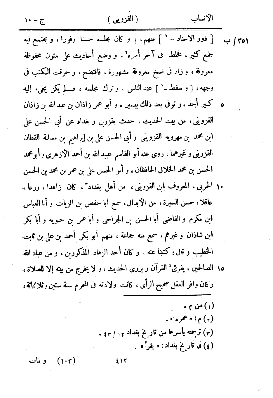 [ذو والاسناد-[1]] منهم،/ وكان مجلسه حسنا وفورا، ويجتمع فيه جمع كثير، فخلط في آخر أمره [2] ، ووضع أحاديث على متون محفوظة معروفة، وزاد في نسخ معروفة مشهورة، فافتضح، وحرقت الكتب في وجهه، [وسقط-[1]] عند الناس، وترك مجلسه، فلم يكن يجيء إليه كبير أحد، وتوفى بعد ذلك بيسير وأبو عمر زاذان بن عبد الله بن زاذان القزويني، من بيت الحديث، حدث بقزوين وبغداد عن أبى الحسن على ابن محمد بن مهرويه القزويني وأبى الحسن على بن إبراهيم بن مسلمة القطان القزويني وغيرهما، روى عنه أبو القاسم عبيد الله بن أحمد الأزهري وأبو محمد الحسن بن محمد الخلال الحافظان وأبو الحسن على بن عمر بن محمد بن الحسن الحربي، المعروف بابن القزويني، من أهل بغداد [3] ، كان زاهدا، ورعا، عاقلا، حسن السيرة، من الأبدال، سمع أبا حفص بن الزيات وأبا العباس ابن مكرم والقاضي أبا الحسن بن الجراحي وأبا عمر بن حيويه وأبا بكر ابن شاذان وغيرهم، سمع منه جماعة، منهم أبو بكر أحمد بن على بن ثابت الخطيب وقال: كتبنا عنه، وكان أحد الزهاد المذكورين، ومن عباد الله الصالحين، يقرئ [4] القرآن ويروى الحديث، ولا يخرج من بيته إلا للصلاة، وكان وافر العقل صحيح الرأى، كانت ولادته في المحرم سنة ستين وثلاثمائة،
