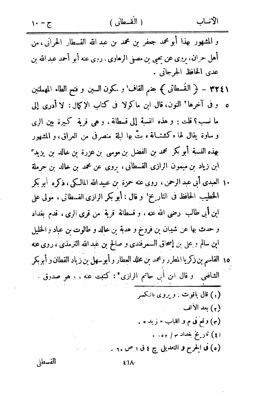 بضم القاف [1] وسكون السين وفتح الطاء المهملتين وفي آخرها [2] النون، قال ابن ماكولا في كتاب الإكمال: لا أدرى إلى ما نسب؟ قلت: وهذه النسبة إلى قسطانة، وهي قرية كبيرة بين الري وساوة يقال لها «كشتانة» بتّ بها ليلة منصرفي من العراق، والمشهور بهذه النسبة أبو بكر محمد بن الفضل بن موسى بن عزرة بن خالد بن يزيد [3] ابن زياد بن ميمون الرازيّ القسطاني، يروى عن محمد بن خالد بن حرملة العبديّ أبى عبد الرحمن، روى عنه حمزة بن عبيد الله المالكي، ذكره أبو بكر الخطيب الحافظ في التاريخ [4] وقال: أبو بكر الرازيّ القسطاني، مولى على ابن أبى طالب رضى الله عنه، وقسطانة قرية من قرى الري، قدم بغداد وحدث بها عن شيبان بن فروخ وهدبة بن خالد وطالوت بن عباد والخليل ابن سالم وعلى بن إسحاق السمرقندي وصالح بن عبد الله الترمذي، روى عنه القاسم بن زكريا المطرز ومحمد بن مخلد العطار وأبو سهل بن زياد القطان وأبو بكر الشافعيّ. وقال ابن أبى حاتم الرازيّ [5] : كتبت عنه، وهو صدوق.
