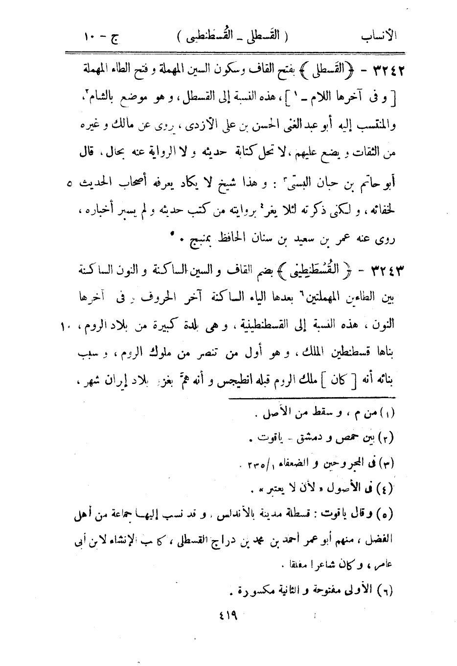 بضم القاف والسين الساكنة والنون الساكنة بين الطاءين المهملتين [6] بعدها الياء الساكنة آخر الحروف وفي آخرها النون، هذه النسبة إلى القسطنطينية، وهي بلدة كبيرة من بلاد الروم، بناها قسطنطين الملك، وهو أول من تنصر من ملوك الروم، وسبب بنائه أنه [كان] ملك الروم قبله انطيجس وأنه همّ بغزو بلاد إيران شهر،