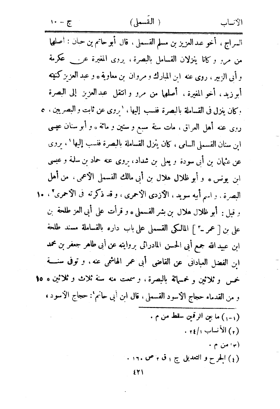 السراج، أخو عبد العزيز بن مسلم القسملي، قال أبو حاتم بن حبان: أصلهما من مرو وكانا ينزلان القسامل بالبصرة، يروى المغيرة عن عكرمة وأبى الزبير، روى عنه ابن المبارك ومروان بن معاوية وعبد العزيز كنيته أبو زيد، أخو المغيرة، أصلهما من مرو وانتقل عبد العزيز إلى البصرة وكان ينزل في القساملة بالبصرة فنسب إليها، [1] يروى عن ثابت والبصريين، روى عنه أهل العراق، مات سنة سبع وستين ومائة وأبو سنان عيسى ابن سنان القسملي السامي، كان ينزل القساملة بالبصرة فنسب إليها [1] ، يروى عن عثمان بن أبى سودة ويعلى بن شداد، يروى عنه حماد بن سلمة وعيسى ابن يونس وأبو ظلال هلال بن أبى مالك القسملي الأعمى، من أهل البصرة، واسم أبيه سويد، الأزدي الأحمري، وقد ذكرته في الأحمري [2] ، وقيل: أبو ظلال هلال بن بشر القسملي وقرأت على أبى العز طلحة بن على بن [عمر-[3]] المالكي القسملي على باب داره بالقساملة مسند طلحة ابن عبيد الله جمع أبى الحسن المادرائى بروايته عن أبى طاهر جعفر بن محمد ابن الفضل العبادانى عن القاضي أبى عمر الهاشمي عنه، وتوفى سنة خمس وثلاثين وخمسمائة بالبصرة، وسمعت منه سنة ثلاث وثلاثين ومن القدماء حجاج الأسود القسملي، قال ابن أبى حاتم [4] : حجاج الأسود،