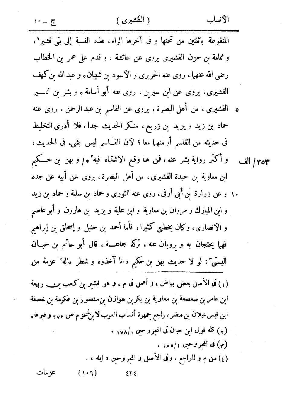 المنقوطة باثنتين من تحتها وفي آخرها الراء، هذه النسبة إلى بنى قشير [1] ، وثمامة بن حزن القشيري يروى عن عائشة، وقدم على عمر بن الخطاب رضى الله عنهما، روى عنه الحريري والأسود بن شيبان وعبد الله بن كهف القشيري، يروى عن ابن سيرين، روى عنه أبو أسامة وبشر بن نمير القشيري، من أهل البصرة، يروى عن القاسم بن عبد الرحمن، روى عنه حماد بن زيد ويزيد بن زريع، منكر الحديث جدا، فلا أدرى التخليط في حديثه من القاسم أو منهما معا؟ لأن القاسم ليس بشيء في الحديث، وأكثر رواية بشر عنه، فمن هنا وقع الاشتباه فيه [2] / وبهز بن حكيم ابن معاوية بن حبدة القشيري، من أهل البصرة، يروى عن أبيه عن جده وعن زرارة بن أبى أوفى، روى عنه الثوري وحماد بن سلمة وحماد بن زيد وابن المبارك ومروان بن معاوية وابن علية ويزيد بن هارون وأبو عاصم والأنصاري، وكان يخطئ كثيرا، فأما أحمد بن حنبل وإسحاق بن إبراهيم فهما يحتجان به ويرويان عنه، تركه جماعة، قال أبو حاتم بن حبان البستي [3] : لولا حديث بهز بن حكيم «انا آخذوه وشطر ماله [4] عزمة من