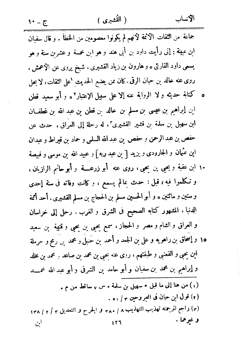 جماعة من الثقات الأئمة لأنهم لم يكونوا معصومين من الخطأ. وقال سفيان ابن عيينة: إني رأيت داود بن أبى هند وهو ابن خمسة وعشرين سنة وهو يسمى داود القارئ وهارون بن زياد القشيري، شيخ يروى عن الأعمش، روى عنه خالد بن حبان الرقى، كان ممن يضع الحديث [1] على الثقات، لا يحل كتابة حديثه ولا الرواية عنه إلا على سبيل الاعتبار [2] وأبو سعيد قطن ابن إبراهيم بن عيسى بن مسلم بن خالد بن قطن بن عبد الله بن غطفان ابن سهيل بن سلمة بن قشير القشيري [3] ، له رحلة إلى العراق، حدث عن حفص بن عبد الرحمن وحفص بن عبد الله السلمي وحماد بن قيراط وعبدان ابن عثمان والجارودي ويزيد [بن عبد ربه] وعبيد الله بن موسى وقبيصة ابن عقبة ويحيى بن يحيى، روى عنه أبو زرعة وأبو حاتم الرازيان، وتكلموا فيه، قيل: حدث بما لم يسمع، وكانت وفاته في سنة إحدى وستين ومائتين وأبو الحسين مسلم بن الحجاج بن مسلم القشيري، أحد أئمة الدنيا، المشهور كتابه الصحيح في الشرق والغرب، رحل إلى خراسان والعراق والشام ومصر والحجاز، سمع يحيى بن يحيى وقتيبة بن سعيد وإسحاق بن راهويه وعلى بن الجعد وأحمد بن حنبل ومحمد بن رمح وحرملة ابن يحيى والقعنبي وطبقتهم، روى عنه يحيى بن محمد بن صاعد ومحمد بن مخلد وإبراهيم بن محمد بن سفيان وأبو حامد بن الشرقي وأبو عبد الله محمد