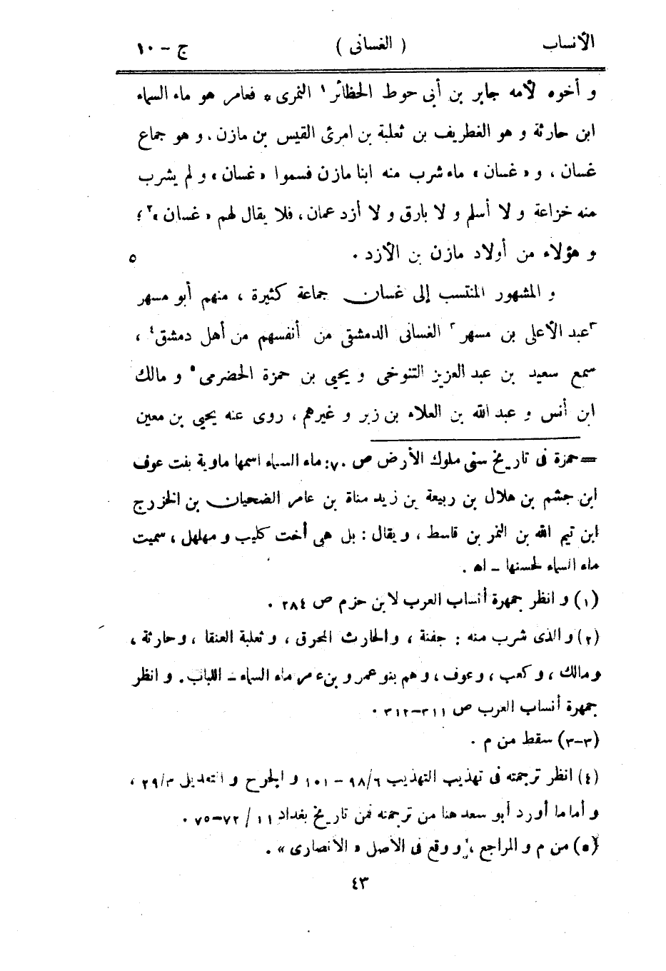 والمشهور المنتسب إلى غسان جماعة كثيرة، منهم أبو مسهر [3] عبد الأعلى بن مسهر [3] الغساني الدمشقيّ من أنفسهم من أهل دمشق [4] ، سمع سعيد بن عبد العزيز التنوخي ويحيى بن حمزة الحضرميّ [5] ومالك ابن أنس وعبد الله بن العلاء بن زبر وغيرهم، روى عنه يحيى بن معين