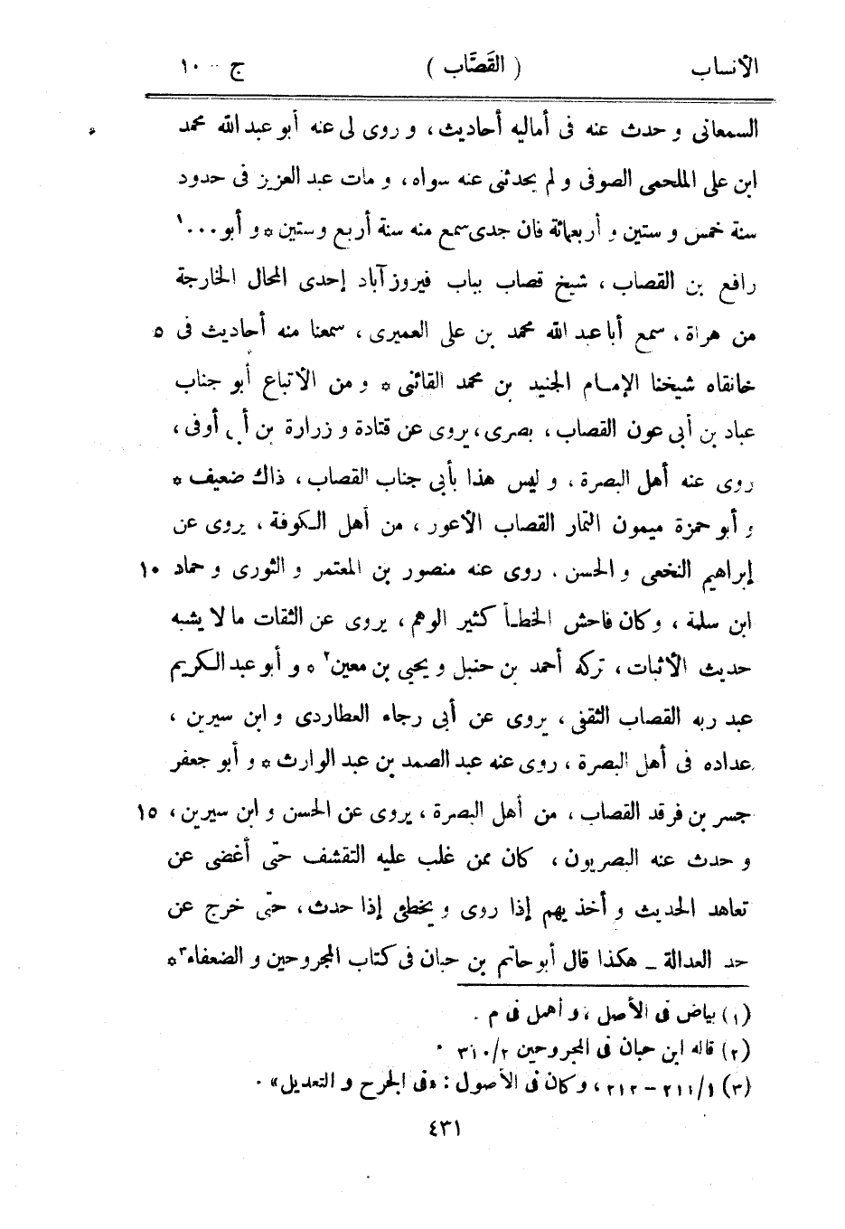 السمعاني وحدث عنه في أماليه أحاديث، وروى لي عنه أبو عبد الله محمد ابن على الملحمى الصوفي ولم يحدثني عنه سواه، ومات عبد العزيز في حدود سنة خمس وستين وأربعمائة فان جدي سمع منه سنة أربع وستين وأبو ... [1] رافع بن القصاب، شيخ قصاب بباب فيروزآباد إحدى المحال الخارجة من هراة، سمع أبا عبد الله محمد بن على العميري، سمعنا منه أحاديث في خانقاه شيخنا الإمام الجنيد بن محمد القائنى ومن الأتباع أبو جناب عباد بن أبى عون القصاب، بصرى، يروى عن قتادة وزرارة بن أبى أوفى، روى عنه أهل البصرة، وليس هذا بأبي جناب القصاب، ذاك ضعيف وأبو حمزة ميمون التمار القصاب الأعور، من أهل الكوفة، يروى عن إبراهيم النخعي والحسن، روى عنه منصور بن المعتمر والثوري وحماد ابن سلمة، وكان فاحش الخطأ كثير الوهم، يروى عن الثقات ما لا يشبه حديث الأثبات، تركه أحمد بن حنبل ويحيى بن معين [2] وأبو عبد الكريم عبد ربه القصاب الثقفي، يروى عن أبى رجاء العطاردي وابن سيرين، عداده في أهل البصرة، روى عنه عبد الصمد بن عبد الوارث وأبو جعفر جسر بن فرقد القصاب، من أهل البصرة، يروى عن الحسن وابن سيرين، وحدث عنه البصريون، كان ممن غلب عليه التقشف حتى أغضى عن تعاهد الحديث وأخذيهم إذا روى ويخطئ إذا حدث، حتى خرج عن حد العدالة- هكذا قال أبو حاتم بن حبان في كتاب المجروحين والضعفاء [3]