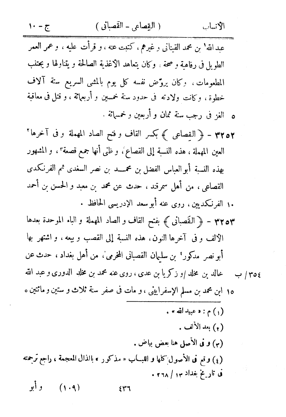 بفتح القاف والصاد المهملة والباء الموحدة بعدها الألف وفي آخرها النون، هذه النسبة إلى القصب وبيعه، واشتهر بها أبو نصر مدكور [4] بن سليمان القصباني المخرمي، من أهل بغداد، حدث عن خالد بن مخلد/ وزكريا بن عدي، روى عنه محمد بن مخلد الدوري وعبد الله ابن محمد بن مسلم الأسفرايينى، ومات في صفر سنة ثلاث وستين ومائتين