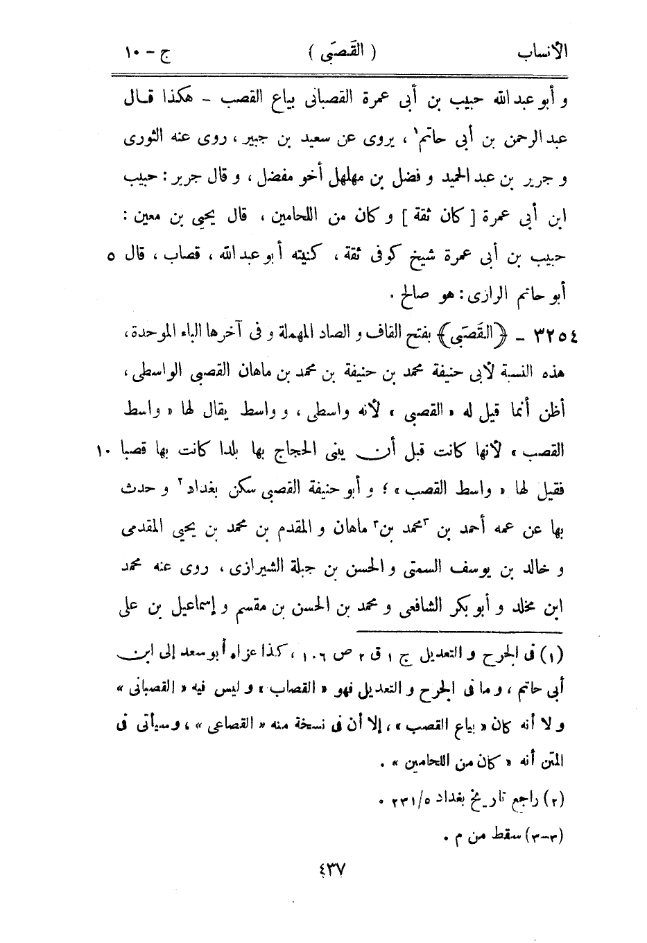 [1] في الجرح والتعديل ج 1 ق 2 ص 106، كذا عزاه أبو سعد إلى ابن أبى حاتم، وما في الجرح والتعديل فهو «القصاب» وليس فيه «القصباني» ولا أنه كان «بياع القصب» ، إلا أن في نسخة منه «القصاعي» ، وسيأتي في المتن أنه «كان من اللحامين» .