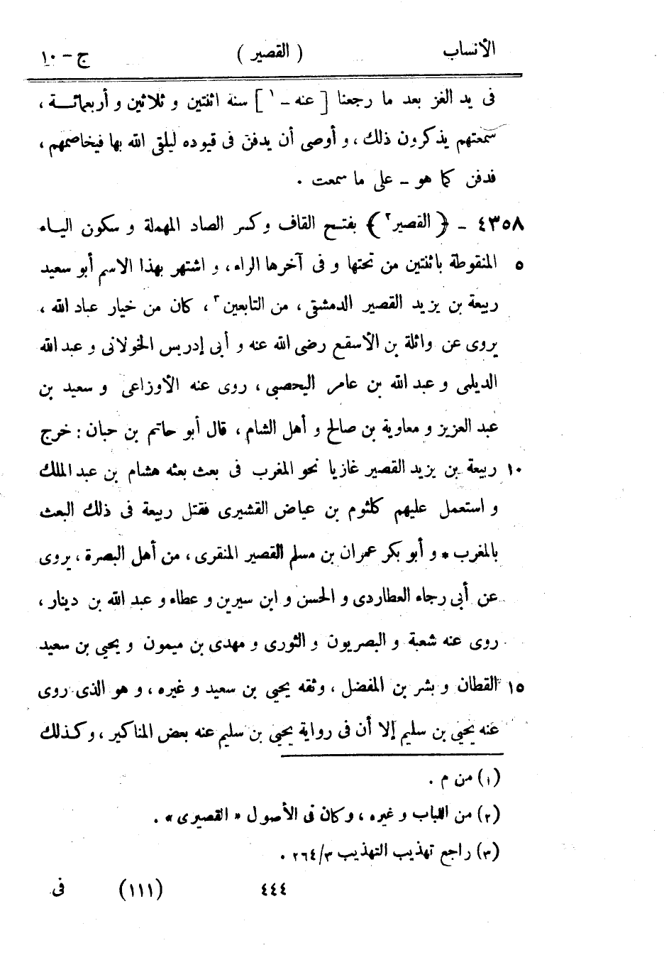 بفتح القاف وكسر الصاد المهملة وسكون الياء المنقوطة باثنتين من تحتها وفي آخرها الراء، واشتهر بهذا الاسم أبو سعيد ربيعة بن يزيد القصير الدمشقيّ، من التابعين [3] ، كان من خيار عباد الله، يروى عن واثلة بن الأسقع رضى الله عنه وأبى إدريس الخولانيّ وعبد الله الديلميّ وعبد الله بن عامر اليحصبى، روى عنه الأوزاعي وسعيد بن عبد العزيز ومعاوية بن صالح وأهل الشام، قال أبو حاتم بن حبان: خرج ربيعة بن يزيد القصير غازيا نحو المغرب في بعث بعثه هشام بن عبد الملك واستعمل عليهم كلثوم بن عياض القشيري فقتل ربيعة في ذلك البعث بالمغرب وأبو بكر عمران بن مسلم القصير المنقري، من أهل البصرة، يروى عن أبى رجاء العطاردي والحسن وابن سيرين وعطاء وعبد الله بن دينار، روى عنه شعبة والبصريون والثوري ومهدي بن ميمون ويحيى بن سعيد القطان وبشر بن المفضل، وثقه يحيى بن سعيد وغيره، وهو الّذي روى عنه يحيى بن سليم إلا أن في رواية يحيى بن سليم عنه بعض المناكير، وكذلك