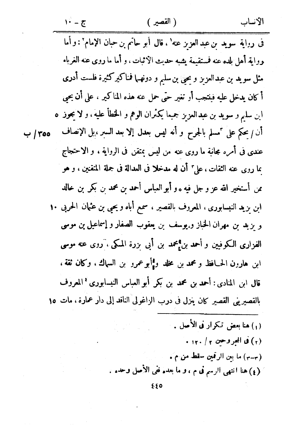 في رواية سويد بن عبد العزيز عنه [1] ، قال أبو حاتم بن حبان الإمام [2] : وأما رواية أهل بلده عنه فمستقيمة يشبه حديث الأثبات، وأما ما روى عنه الغرباء مثل سويد بن عبد العزيز ويحيى بن سليم ودونهما فمناكير كثيرة فلست أدرى أكان يدخل عليه فينتجب أو تغير حتى حمل عنه هذه المناكير، على أن يحيى ابن سليم وسويد بن عبد العزيز جميعا يكثران الوهم والخطأ عليه، ولا يجوز أن/ يحكم على [3] مسلم بالجرح وأنه ليس بعدل إلا بعد السبر، بل الإنصاف عندي في أمره مجانبة ما روى عنه من ليس بمتقن في الرواية، والاحتجاج بما روى عنه الثقات، على [3] أن له مدخلا في العدالة في جملة المتقنين، وهو ممن أستخير الله عز وجل فيه وأبو العباس أحمد بن محمد بن بكر بن خالد ابن يزيد النيسابورىّ، المعروف بالقصير، سمع أباه ويحيى بن عثمان الحربي ويزيد بن مهران الخباز ويوسف بن يعقوب الصفار وإسماعيل بن موسى الفزاري الكوفيين وأحمد بن محمد بن أبى بزرة المكيّ، روى عنه موسى ابن هارون الحافظ ومحمد بن مخلد وأبو عمرو بن السماك، وكان ثقة، قال ابن المنادي: أحمد بن محمد بن بكر أبو العباس النيسابورىّ [4] المعروف بالقصيرينى القصير كان ينزل في درب الزاغولى الناقد إلى دار عمارة، مات