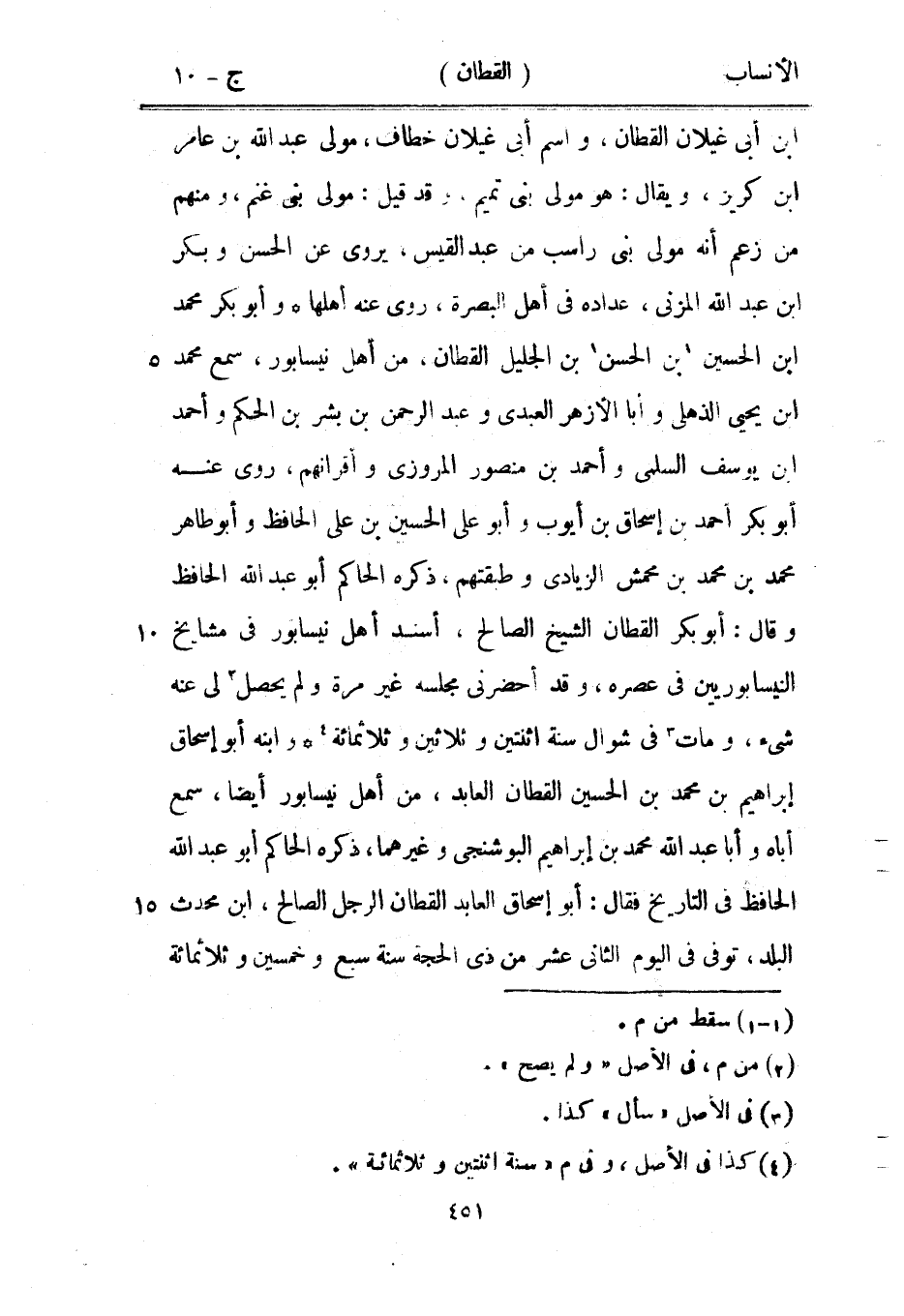 ابن أبى غيلان القطان، واسم أبى غيلان خطاف، مولى عبد الله بن عامر ابن كريز، ويقال: هو مولى بنى تميم، وقد قيل: مولى بنى غنم، ومنهم من زعم أنه مولى بنى راسب من عبد القيس، يروى عن الحسن وبكر ابن عبد الله المزني، عداده في أهل البصرة، روى عنه أهلها وأبو بكر محمد ابن الحسين [1] بن الحسن [1] بن الجليل القطان، من أهل نيسابور، سمع محمد ابن يحيى الذهلي وأبا الأزهر العبديّ وعبد الرحمن بن بشر بن الحكم وأحمد ابن يوسف السلمي وأحمد بن منصور المروزي وأقرانهم، روى عنه أبو بكر أحمد بن إسحاق بن أيوب وأبو على الحسين بن على الحافظ وأبو طاهر محمد بن محمد بن محمش الزيادي وطبقتهم، ذكره الحاكم أبو عبد الله الحافظ وقال: أبو بكر القطان الشيخ الصالح، أسند أهل نيسابور في مشايخ النيسابوريين في عصره، وقد أحضرنى مجلسه غير مرة ولم يحصل [2] لي عنه شيء، ومات [3] في شوال سنة اثنتين وثلاثين وثلاثمائة [4] وابنه أبو إسحاق إبراهيم بن محمد بن الحسين القطان العابد، من أهل نيسابور أيضا، سمع أباه وأبا عبد الله محمد بن إبراهيم البوشنجي وغيرهما، ذكره الحاكم أبو عبد الله الحافظ في التاريخ فقال: أبو إسحاق العابد القطان الرجل الصالح، ابن محدث البلد، توفى في اليوم الثاني عشر من ذي الحجة سنة سبع وخمسين وثلاثمائة