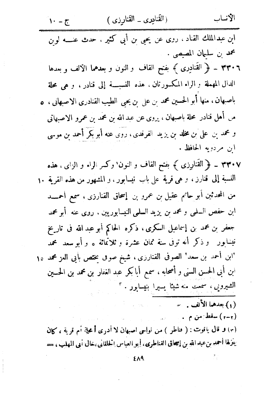 بفتح القاف والنون [1] وكسر الراء والزاى، هذه النسبة إلى قنارز، وهي قرية على باب نيسابور، والمشهور من هذه القرية من المحدثين أبو حاتم عقيل بن عمرو بن إسحاق القنارزى، سمع أحمد ابن حفص السلمي ومحمد بن يزيد السلمي النيسابوريين، روى عنه أبو محمد جعفر بن محمد بن إسماعيل السكرى، ذكره الحاكم أبو عبد الله في تاريخ نيسابور وذكر أنه توفى سنة ثمان عشرة وثلاثمائة وأبو سعد محمد [2] ابن أحمد بن سعد [2] الصوفي القنارزى، شيخ صوفى يختص بأبي العز محمد ابن أبى الحسن السنى وأصحابه، سمع أبا بكر عبد الغفار بن محمد بن الحسين الشيرويى، سمعت منه شيئا يسيرا بنيسابور. [3]