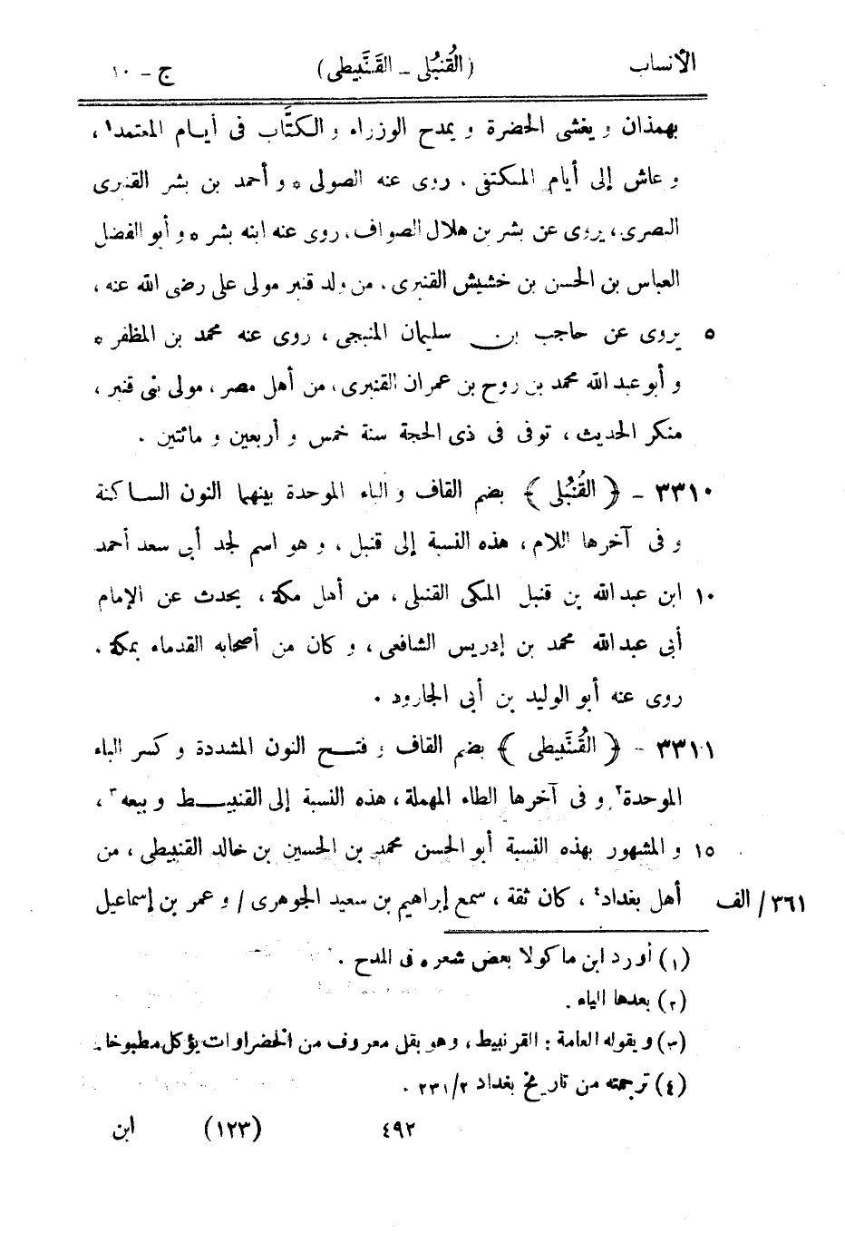بضم القاف وفتح النون المشددة وكسر الباء الموحدة [2] وفي آخرها الطاء المهملة، هذه النسبة إلى القنبيط وبيعه [3] ، والمشهور بهذه النسبة أبو الحسن محمد بن الحسين بن خالد القنبيطي، من أهل بغداد [4] ، كان ثقة، سمع إبراهيم بن سعيد الجوهري/ وعمر بن إسماعيل