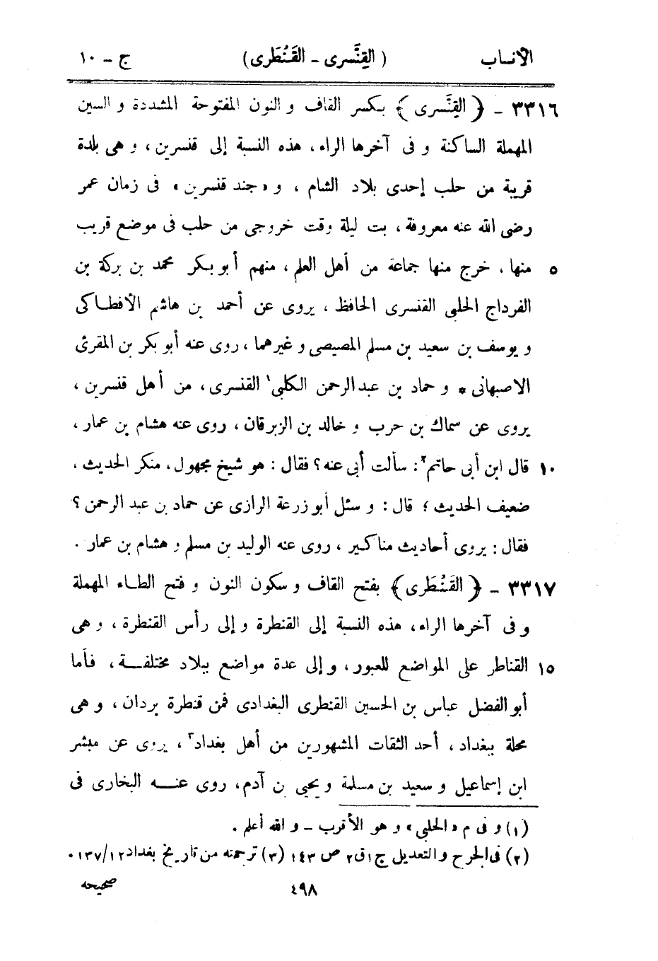 بكسر القاف والنون المفتوحة المشددة والسين المهملة الساكنة وفي آخرها الراء، هذه النسبة إلى قنسرين، وهي بلدة قريبة من حلب إحدى بلاد الشام، و «جند قنسرين» في زمان عمر رضى الله عنه معروفة، بت ليلة وقت خروجي من حلب في موضع قريب منها، خرج منها جماعة من أهل العلم، منهم أبو بكر محمد بن بركة بن الفرداج الحلبي القنسرى الحافظ، يروى عن أحمد بن هاشم الأفطاكى ويوسف بن سعيد بن مسلم المصيصي وغيرهما، روى عنه أبو بكر بن المقرئ الأصبهاني وحماد بن عبد الرحمن الكلبي [1] القنسرى، من أهل قنسرين، يروى عن سماك بن حرب وخالد بن الزبرقان، روى عنه هشام بن عمار، قال ابن أبى حاتم [2] : سألت أبى عنه؟ فقال: هو شيخ مجهول، منكر الحديث، ضعيف الحديث، قال: وسئل أبو زرعة الرازيّ عن حماد بن عبد الرحمن؟