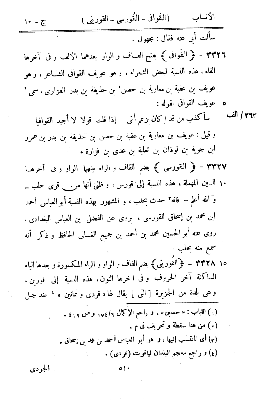 بضم القاف والراء بينهما الواو وفي آخرها السين المهملة، هذه النسبة إلى قورس، وظني أنها من قرى حلب- والله أعلم- فإنه [3] حدث بحلب، والمشهور بهذه النسبة أبو العباس أحمد ابن محمد بن إسحاق القورسى، يروى عن الفضل بن العباس البغدادي، روى عنه أبو الحسين محمد بن أحمد بن جميع الغساني الحافظ وذكر أنه سمع منه بحلب.