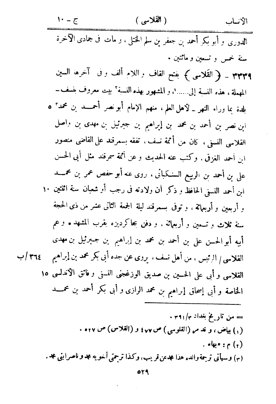 بفتح القاف واللام ألف وفي آخرها السين المهملة، هذه النسبة إلى.... [1] ، والمشهور بهذه النسبة [2] بيت معروف بنسف- بلدة بما وراء النهر- لأهل العلم، منهم الإمام أبو نصر أحمد بن محمد [3] ابن نصر بن أحمد بن محمد بن إبراهيم بن جبرئيل بن مهدي بن واصل القلاسى النسفي، كان من أئمة نسف، تفقه بسمرقند على القاضي منصور ابن أحمد الغزقى، وكتب عنه الحديث وعن أئمة سمرقند مثل أبى الحسن على بن أحمد بن الربيع السنكباثى، روى عنه أبو حفص عمر بن محمد ابن أحمد النسفي الحافظ وذكر أن ولادته في رجب أو شعبان سنة اثنتين وأربعين وأربعمائة، وتوفى بسمرقند ليلة الجمعة الثاني عشر من ذي الحجة سنة ثلاث وتسعين وأربعمائة، ودفن بجاكرديزه بقرب المشهد وعم أبيه أبو الحسن على بن أحمد بن محمد بن إبراهيم بن جبرئيل بن مهدي القلاسى/ الرئيس، من أهل نسف، يروى عن جده أبى بكر محمد بن إبراهيم القلاسى وأبى على الحسين بن صديق الوزغجنى النسفي وفائق الأندلسى الخاصة وأبى إسحاق إبراهيم بن محمد الرازيّ وأبى بكر أحمد بن محمد