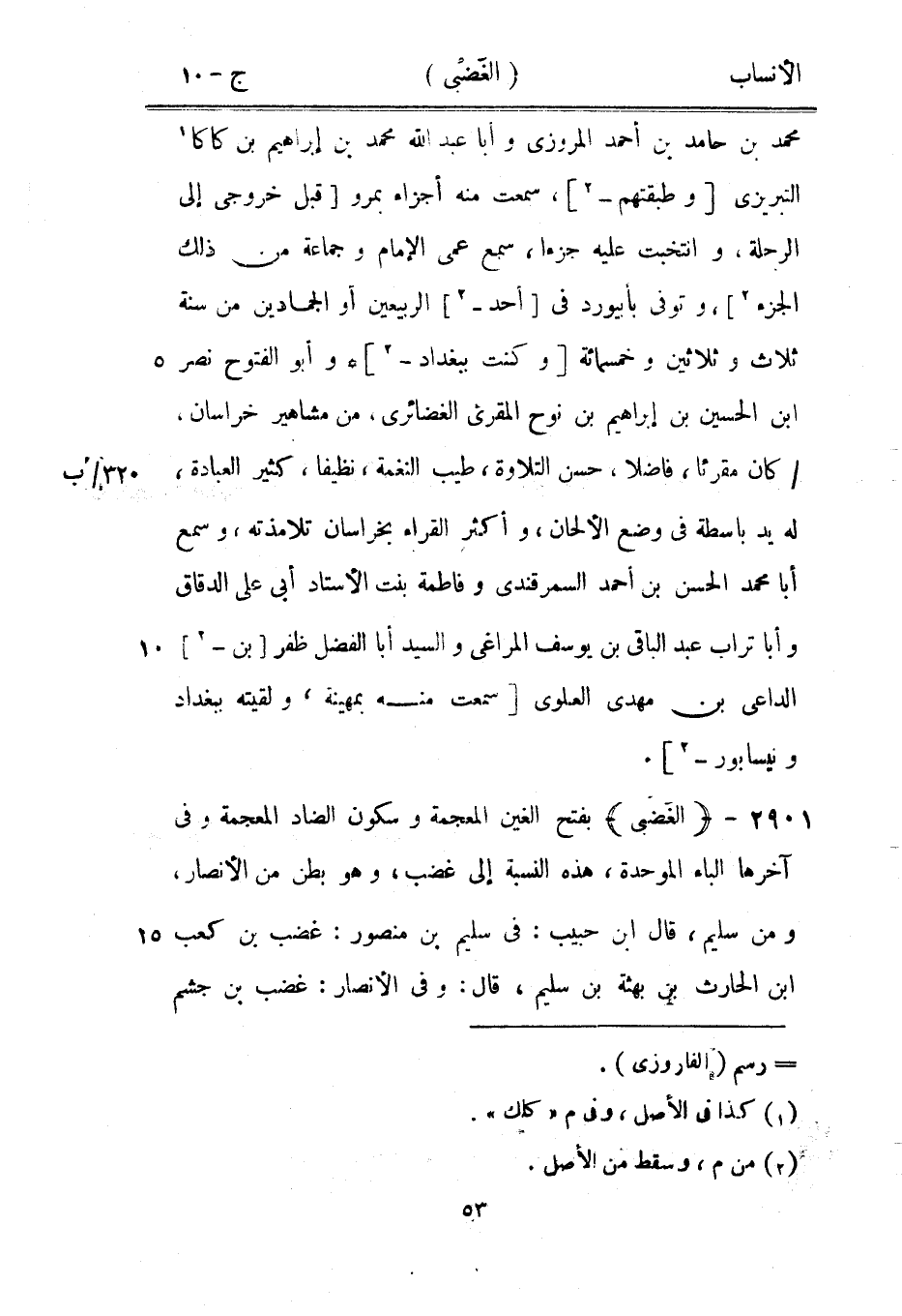 محمد بن حامد بن أحمد المروزي وأبا عبد الله محمد بن إبراهيم بن كاكا [1] التبريزي [وطبقتهم-[2]] ، سمعت منه أجزاء بمرو [قبل خروجي إلى الرحلة، وانتخبت عليه جزءا، سمع عمى الإمام وجماعة من ذلك الجزء [2]] ، وتوفى بأبيورد في [أحد-[2]] الربيعين أو الجمادين من سنة ثلاث وثلاثين وخمسمائة [وكنت ببغداد-[2]] وأبو الفتوح نصر ابن الحسين بن إبراهيم بن نوح المقرئ الغضائري، من مشاهير خراسان،/ كان مقرئا، فاضلا، حسن التلاوة، طيب النغمة، نظيفا، كثير العبادة، له يد باسطة في وضع الألحان، وأكثر القراء بخراسان تلامذته، وسمع أبا محمد الحسن بن أحمد السمرقندي وفاطمة بنت الأستاد أبى على الدقاق وأبا تراب عبد الباقي بن يوسف المراغي والسيد أبا الفضل ظفر [بن-[2]] الداعي بن مهدي العلويّ [سمعت منه بمهينة، ولقيته ببغداد ونيسابور-[2]] .