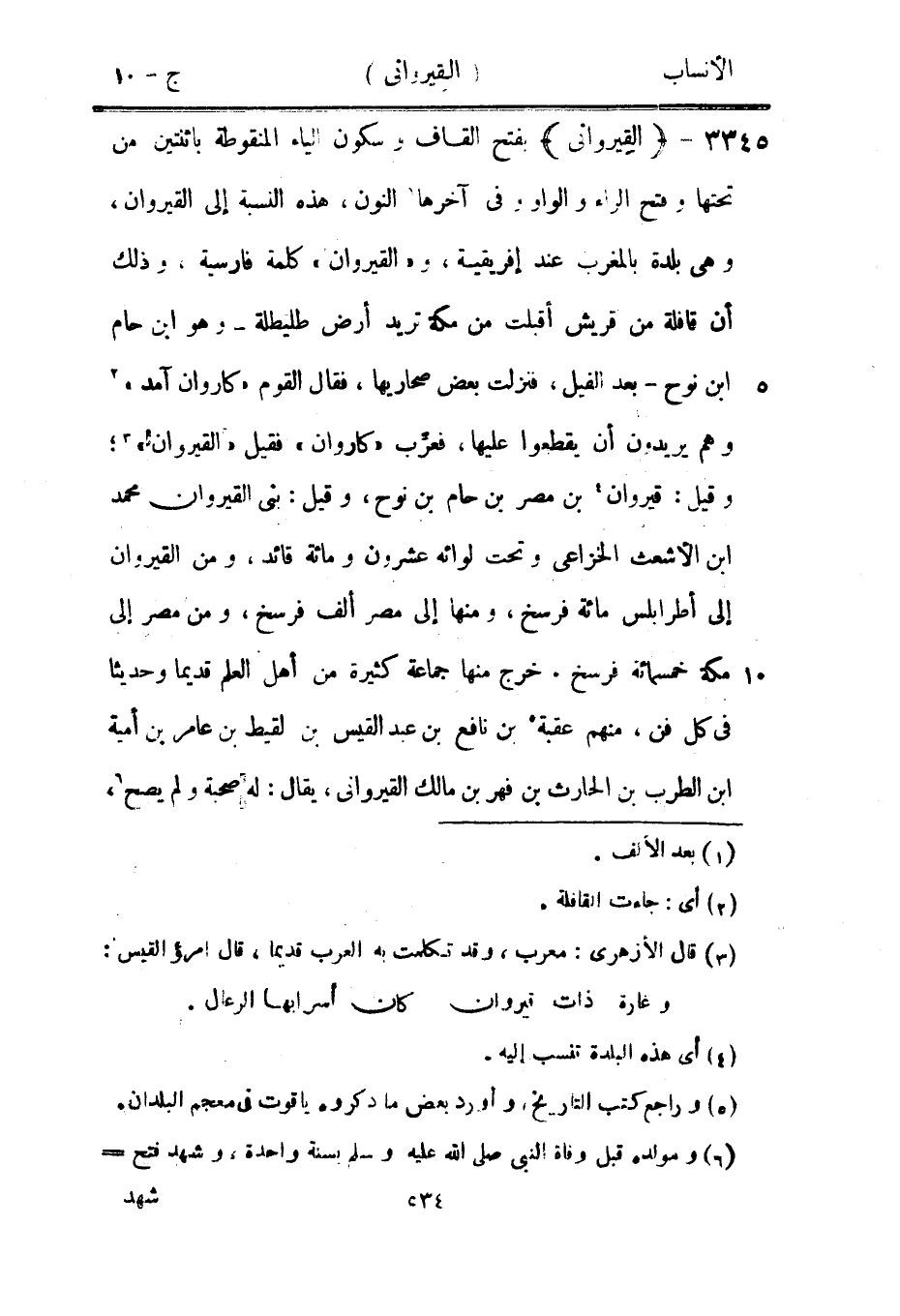 بفتح القاف وسكون الياء المنقوطة باثنتين من تحتها وفتح الراء والواو وفي آخرها [1] النون، هذه النسبة إلى القيروان، وهي بلدة بالمغرب عند إفريقية، و «القيروان» كلمة فارسية، وذلك أن قافلة من قريش أقبلت من مكة تريد أرض طليطلة- وهو ابن حام ابن نوح- بعد الفيل، فنزلت بعض صحاريها، فقال القوم «كاروان آمد» [2] وهم يريدون أن يقطعوا عليها، فعرّب «كاروان» فقيل «القيروان» [3] ، وقيل: قيروان [4] بن مصر بن حام بن نوح، وقيل: بنى القيروان محمد ابن الأشعث الخزاعي وتحت لوائه عشرون ومائة قائد، ومن القيروان إلى أطرابلس مائة فرسخ، ومنها إلى مصر ألف فرسخ، ومن مصر إلى مكة خمسمائة فرسخ. خرج منها جماعة كثيرة من أهل العلم قديما وحديثا في كل فن، منهم عقبة [5] بن نافع بن عبد القيس بن لقيط بن عامر بن أمية ابن الطرب بن الحارث بن فهر بن مالك القيرواني، يقال: له صحبة ولم يصح [6] ،