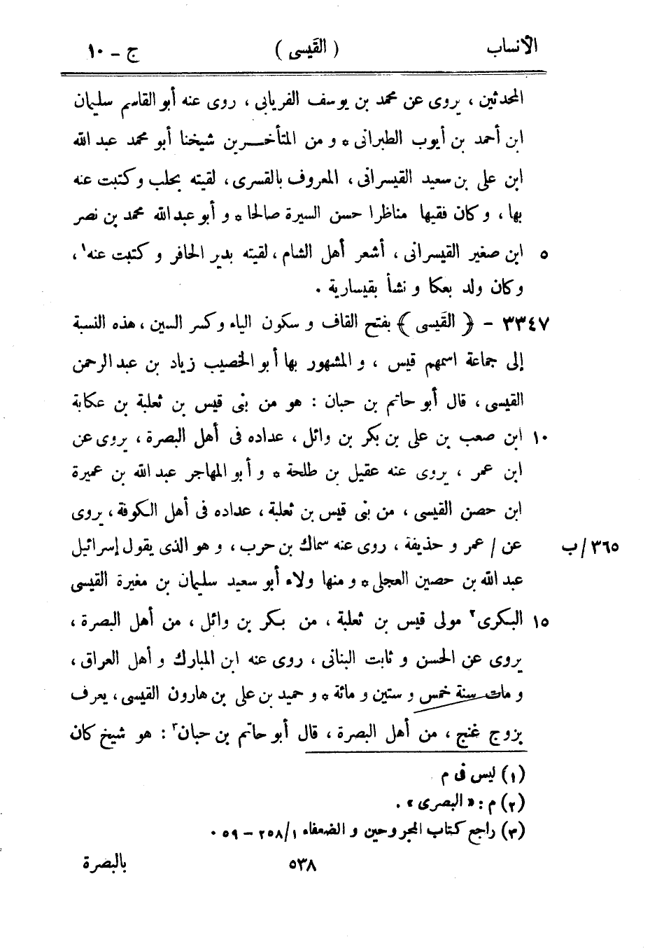 بفتح القاف وسكون الياء وكسر السين، هذه النسبة إلى جماعة اسمهم قيس، والمشهور بها أبو الخصيب زياد بن عبد الرحمن القيسي، قال أبو حاتم بن حبان: هو من بنى قيس بن ثعلبة بن عكابة ابن صعب بن على بن بكر بن وائل، عداده في أهل البصرة، يروى عن ابن عمر، يروى عنه عقيل بن طلحة وأبو المهاجر عبد الله بن عميرة ابن حصن القيسي، من بنى قيس بن ثعلبة، عداده في أهل الكوفة، يروى عن/ عمرو حذيفة، روى عنه سماك بن حرب، وهو الّذي يقول إسرائيل عبد الله بن حصين العجليّ ومنها ولاء أبو سعيد سليمان بن مغيرة القيسي البكري [2] مولى قيس بن ثعلبة، من بكر بن وائل، من أهل البصرة، يروى عن الحسن وثابت البناني، روى عنه ابن المبارك وأهل العراق، ومات سنة خمس وستين ومائة وحميد بن على بن هارون القيسي، يعرف بزوج غنج، من أهل البصرة، قال أبو حاتم بن حبان [3] : هو شيخ كان