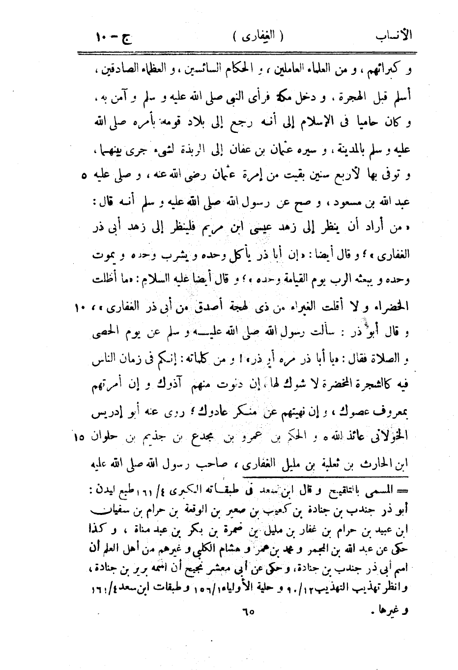وكبرائهم، ومن العلماء العاملين، والحكام السائسين، والعظماء الصادقين، أسلم قبل الهجرة، ودخل مكة فرأى النبي صلى الله عليه وسلم وآمن به، وكان حاميا في الإسلام إلى أنه رجع إلى بلاد قومه بأمره صلى الله عليه وسلم بالمدينة، وسيره عثمان بن عفان إلى الرَّبَذَة لشيء جرى بينهما، وتوفى بها لأربع سنين بقيت من إمرة عثمان رضى الله عنه، وصلى عليه عبد الله بن مسعود، وصح عن رسول الله صلى الله عليه وسلم أنه قال: «من أراد أن ينظر إلى زهد عيسى ابن مريم فلينظر إلى زهد أبى ذر الغفاريّ» ، وقال أيضا: «إن أبا ذر يأكل وحده ويشرب وحده ويموت وحده ويبعثه الرب يوم القيامة وحده» ، وقال أيضا عليه السلام: «ما أظلت الخضراء ولا أقلت الغبراء من ذي لهجة أصدق من أبى ذر الغفاريّ» ، وقال أبو ذر: سألت رسول الله صلى الله عليه وسلم عن يوم الحصى والصلاة فقال: «يا أبا ذر مره أو ذر» ! ومن كلماته: إنكم في زمان الناس فيه كالشجرة المخضرة لا شوك لها، إن دنوت منهم آذوك وإن أمرتهم بمعروف عصوك، وإن نهيتهم عن منكر عادوك، روى عنه أبو إدريس الخولانيّ عائذ الله والحكم بن عمرو بن مجدع بن جذيم بن حلوان ابن الحارث بن ثعلبة بن مليل الغفاريّ، صاحب رسول الله صلى الله عليه