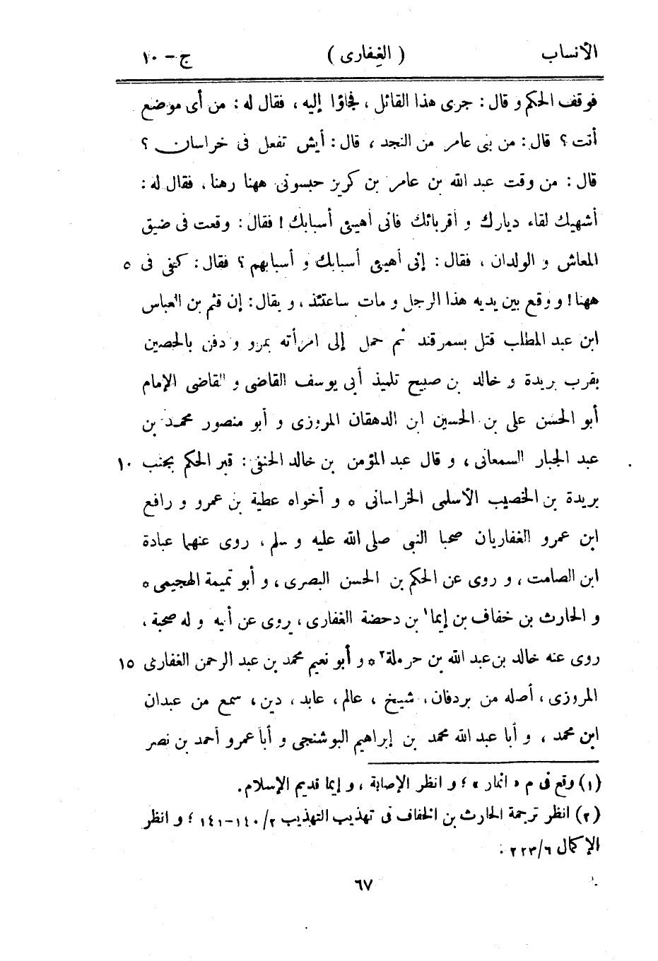 أشهيك لقاء ديارك وأقربائك فانى أهيئ أسبابك! فقال: وقعت في ضيق المعاش والولدان، فقال: إني أهيئ أسبابك وأسبابهم؟ فقال: كفى في هاهنا! ووقع بين يديه هذا الرجل ومات ساعتئذ، ويقال: إن قثم بن العباس ابن عبد المطلب قتل بسمرقند ثم حمل إلى امرأته بمرو ودفن بالحصين بقرب بريدة وخالد بن صبيح تلميذ أبى يوسف القاضي والقاضي الإمام أبو الحسن على بن الحسين ابن الدهقان المروزي وأبو منصور محمد بن عبد الجبار السمعاني، وقال عبد المؤمن بن خالد الحنفي: قبر الحكم بجنب بريدة بن الخصيب الأسلمي الخراساني وأخواه عطية بن عمرو ورافع ابن عمرو الغفاريان صحبا النبي صلى الله عليه وسلم، روى عنهما عبادة ابن الصامت، وروى عن الحكم بن الحسن البصري، وأبو تميمة الهجيمي والحارث بن خفاف بن إيماء [1] بن دحضة الغفاريّ، يروى عن أبيه وله صحبة، روى عنه خالد بن عبد الله بن حرملة [2] وأبو نعيم محمد بن عبد الرحمن الغفاريّ المروزي، أصله من بردفان، شيخ، عالم، عابد، دين، سمع من عبدان ابن محمد، وأبا عبد الله محمد بن إبراهيم البوشنجي وأبا عمرو أحمد بن نصر