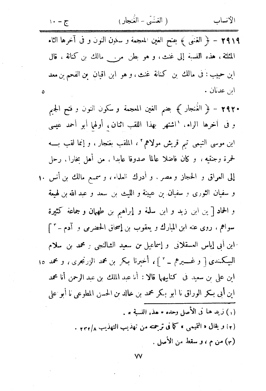 بضم الغين المعجمة وسكون النون وفتح الجيم وفي آخرها الراء، [1] اشتهر بهذا اللقب اثنان، أو لهما أبو أحمد عيسى ابن موسى التيمي تيم قريش مولاهم [2] ، الملقب بغنجار، وإنما لقب به لحمرة وجنتيه، وكان فاضلا عالما صدوقا عابدا، من أهل بخارا، رحل إلى العراق والحجاز ومصر، وأدرك العلماء، وسمع مالك بن أنس وسفيان الثوري وسفيان بن عيينة والليث بن سعد وعبد الله بن لهيعة والحماد [ين ابن زيد وابن سلمة وإبراهيم بن طهمان وجماعة كثيرة سواهم، روى عنه ابن المبارك ويعقوب بن إسحاق الحضرميّ وآدم-[3]] ابن أبى إياس العسقلاني وإسماعيل بن سعيد الشالنجى ومحمد بن سلام البيكندي [وغيرهم-[3]] ، أخبرنا بكر بن محمد الزرنجرى، ومحمد ابن على بن سعيد في كتابيهما قالا: أنا عبد الملك بن عبد الرحمن أنا محمد ابن أبى بكر الوراق نا أبو بكر محمد بن خالد بن الحسن المطوعي نا أبو على