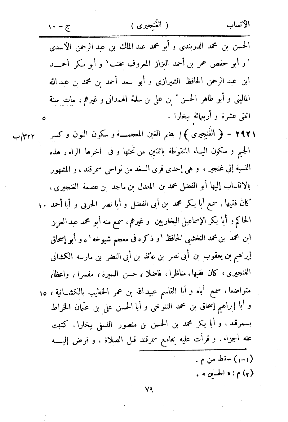 / بضم الغين المعجمة وسكون النون وكسر الجيم وسكون الياء المنقوطة باثنتين من تحتها وفي آخرها الراء، هذه النسبة إلى غنجير، وهي إحدى قرى السغد من نواحي سمرقند، والمشهور بالانتساب إليها أبو الفضل محمد بن المعدل بن ماجد بن عصمة الغنجيرى، كان فقيها، سمع أبا بكر محمد بن أبى الفضل وأبا نصر الحربي وأبا أحمد الحاكم وأبا بكر الإسماعيلي البخاريين وغيرهم، سمع منه أبو محمد عبد العزيز ابن محمد بن محمد النخشبى الحافظ [1] وذكره في معجم شيوخه [1] وأبو إسحاق إبراهيم بن يعقوب بن أبى نصر بن عائذ بن أبى النضر بن مارسه الكشاني الغنجيرى، كان فقيها، مناظرا، فاضلا، حسن السيرة، مفسرا، واعظا، متواضعا، سمع أباه وأبا القاسم عبيد الله بن عمر الخطيب بالكشانية، وأبا إبراهيم إسحاق بن محمد التنوخي وأبا الحسن على بن عثمان الخراط بسمرقند، وأبا بكر محمد بن الحسن بن منصور النسفي ببخارا، كتبت عنه أجزاء، وقرأت عليه بجامع سمرقند قبل الصلاة، وفوض إليه