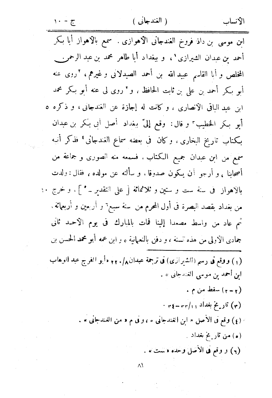 [1] ووقع في رسم (الشيرازي) في ترجمة عبدان 8/ 220 «أبو الفرج عبد الوهاب ابن أحمد بن موسى الغندجاني» .