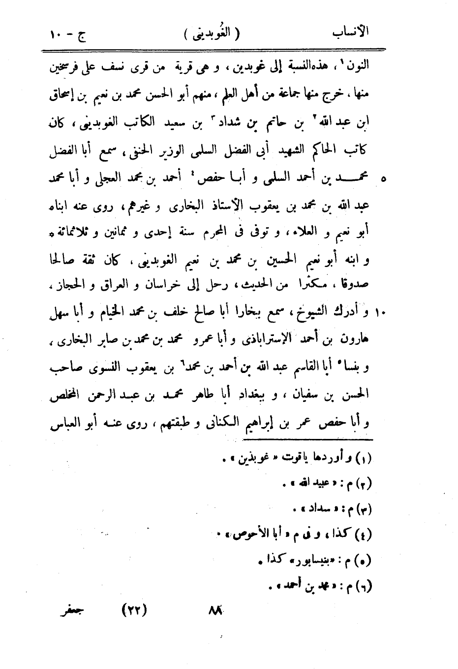 النون [1] ، هذه النسبة إلى غوبدين، وهي قرية من قرى نسف على فرسخين منها، خرج منها جماعة من أهل العلم، منهم أبو الحسن محمد بن نعيم بن إسحاق ابن عبد الله [2] بن حاتم بن شداد [3] بن سعيد الكاتب الغوبدينى، كان كاتب الحاكم الشهيد أبى الفضل السلمي الوزير الحنفي، سمع أبا الفضل محمد بن أحمد السلمي وأبا حفص [4] أحمد بن محمد العجليّ وأبا محمد عبد الله بن محمد بن يعقوب الأستاذ البخاري وغيرهم، روى عنه ابناه أبو نعيم والعلاء، وتوفى في المحرم سنة إحدى وثمانين وثلاثمائة وابنه أبو نعيم الحسين بن محمد بن نعيم الغوبدينى، كان ثقة صالحا صدوقا، مكثرا من الحديث، رحل إلى خراسان والعراق والحجاز، وأدرك الشيوخ، سمع ببخارا أبا صالح خلف بن محمد الخيام وأبا سهل هارون بن أحمد الأستراباذي وأبا عمرو محمد بن محمد بن صابر البخاري، وبنسا [5] أبا القاسم عبد الله بن أحمد بن محمد [6] بن يعقوب النسوي صاحب الحسن بن سفيان، وببغداد أبا طاهر محمد بن عبد الرحمن المخلص وأبا حفص عمر بن إبراهيم الكناني وطبقتهم، روى عنه أبو العباس