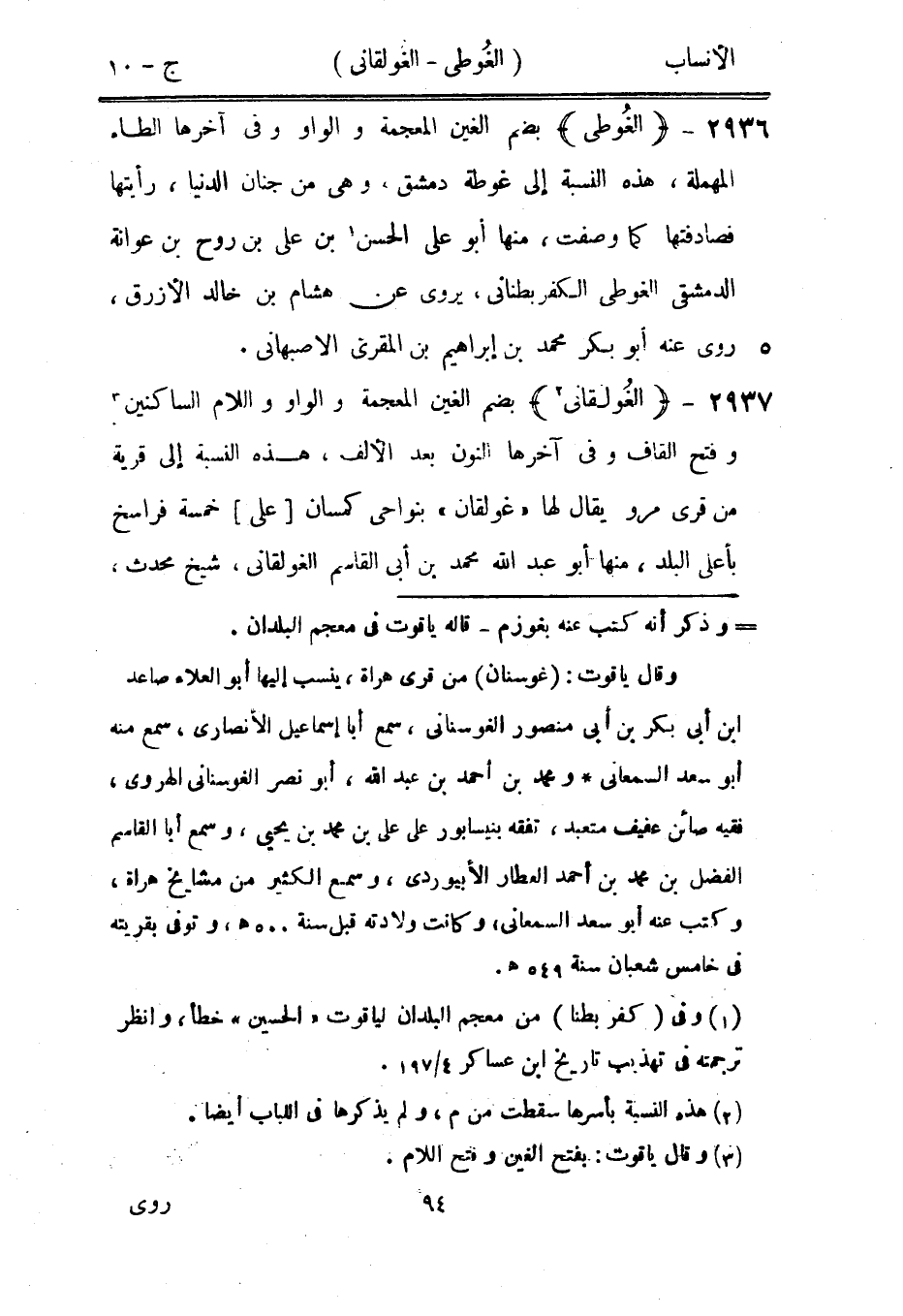 بضم الغين المعجمة والواو واللام الساكنين [3] وفتح القاف وفي آخرها النون بعد الألف، هذه النسبة إلى قرية من قرى مرو يقال لها «غولقان» بنواحي كمسان [على] خمسة فراسخ بأعلى البلد، منها أبو عبد الله محمد بن أبى القاسم الغولقانى، شيخ محدث،