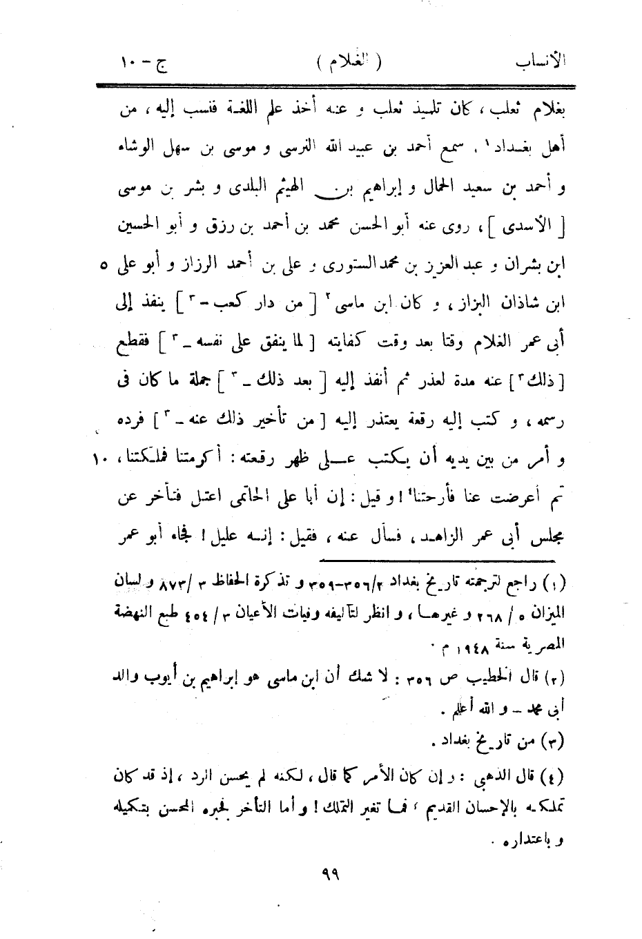 بغلام ثعلب، كان تلميذ ثعلب وعنه أخذ علم اللغة فنسب إليه، من أهل بغداد [1] ، سمع أحمد بن عبيد الله النرسي وموسى بن سهل الوشاء وأحمد بن سعيد الحمال وإبراهيم بن الهيثم البلدي وبشر بن موسى [الأسدي] ، روى عنه أبو الحسن محمد بن أحمد بن رزق وأبو الحسين ابن بشران وعبد العزيز بن محمد الستورى وعلى بن أحمد الرزاز وأبو على ابن شاذان البزاز، وكان ابن ماسى [2] [من دار كعب-[3]] ينفذ إلى أبى عمر الغلام وقتا بعد وقت كفايته [لما ينفق على نفسه-[3]] فقطع [ذلك [3]] عنه مدة لعذر ثم أنفذ إليه [بعد ذلك-[3]] جملة ما كان في رسمه، وكتب إليه رقعة يعتذر إليه [من تأخير ذلك عنه-[3]] فرده وأمر من بين يديه أن يكتب على ظهر رقعته: أكرمتنا فملكتنا، تم أعرضت عنا فأرحتنا [4] ! وقيل: إن أبا على الحاتمي اعتل فتأخر عن مجلس أبى عمر الزاهد، فسأل عنه، فقيل: إنه عليل! فجاء أبو عمر