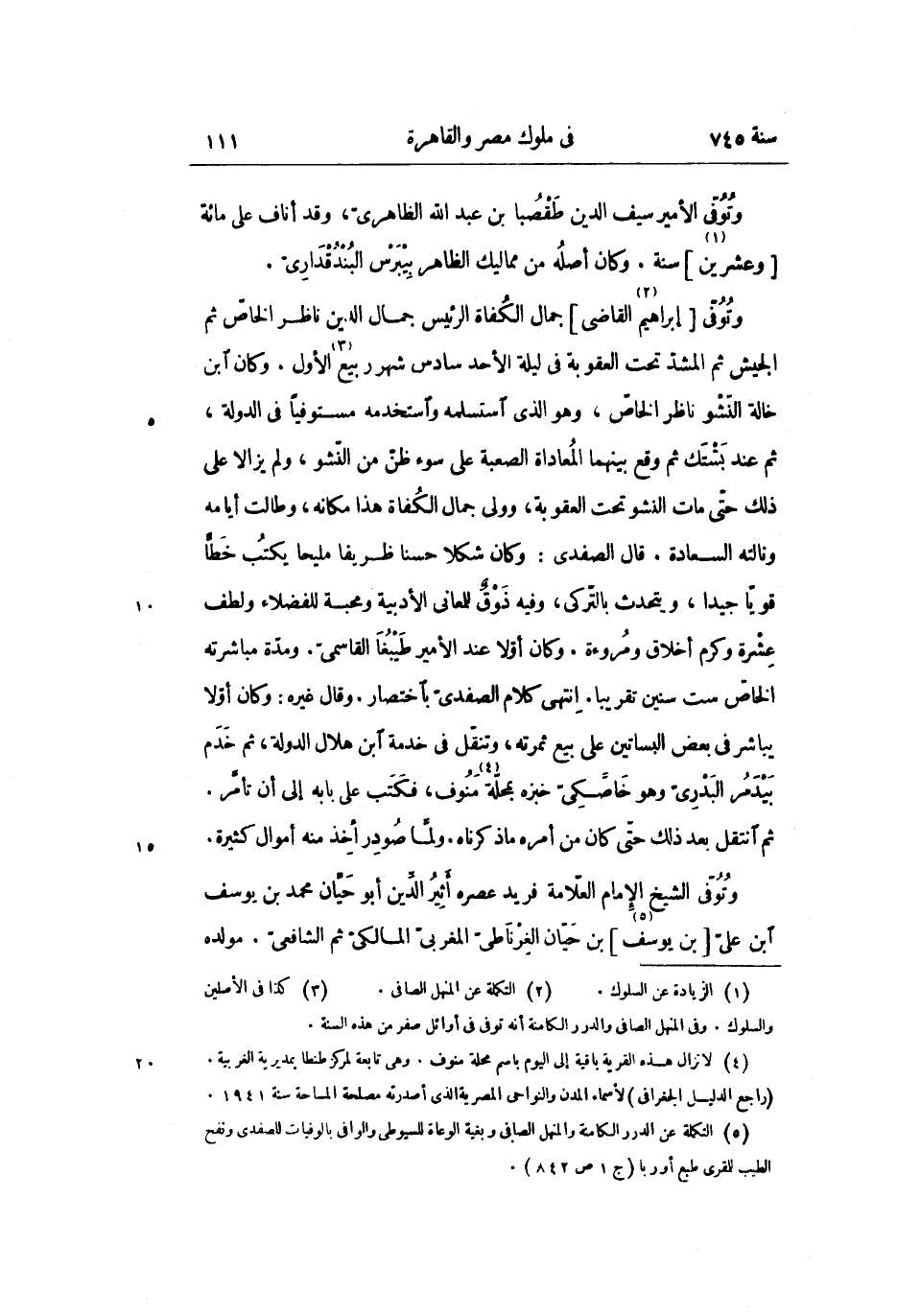 وتوفّى [إبراهيم «2» القاضى] جمال الكفاة الرئيس جمال الدين ناظر الخاصّ ثم الجيش ثم المشدّ تحت العقوبة فى ليلة الأحد سادس شهر ربيع «3» الأول. وكان ابن خالة النّشو ناظر الخاصّ، وهو الذي استسلمه واستخدمه مستوفيا فى الدولة، ثم عند بشتك ثم وقع بينهما المعاداة الصعبة على سوء ظنّ من النّشو، ولم يزالا على ذلك حتّى مات النشو تحت العقوبة، وولى جمال الكفاة هذا مكانه، وطالت أيامه ونالته السعادة. قال الصفدى: وكان شكلا حسنا ظريفا مليحا يكتب خطّا قويّا جيدا، ويتحدث بالتّركى، وفيه ذوق للمعانى الأدبية ومحبة للفضلاء ولطف عشرة وكرم أخلاق ومروءة. وكان أوّلا عند الأمير طيبغا القاسمىّ. ومدّة مباشرته الخاصّ ست سنين تقريبا. انتهى كلام الصفدىّ باختصار. وقال غيره: وكان أوّلا يباشر فى بعض البساتين على بيع ثمرته، وتنقّل فى خدمة ابن هلال الدولة، ثم خدم بيدمر البدرىّ وهو خاصّكىّ خبزه بمحلّة «4» منوف، فكتب على بابه إلى أن تأمّر.