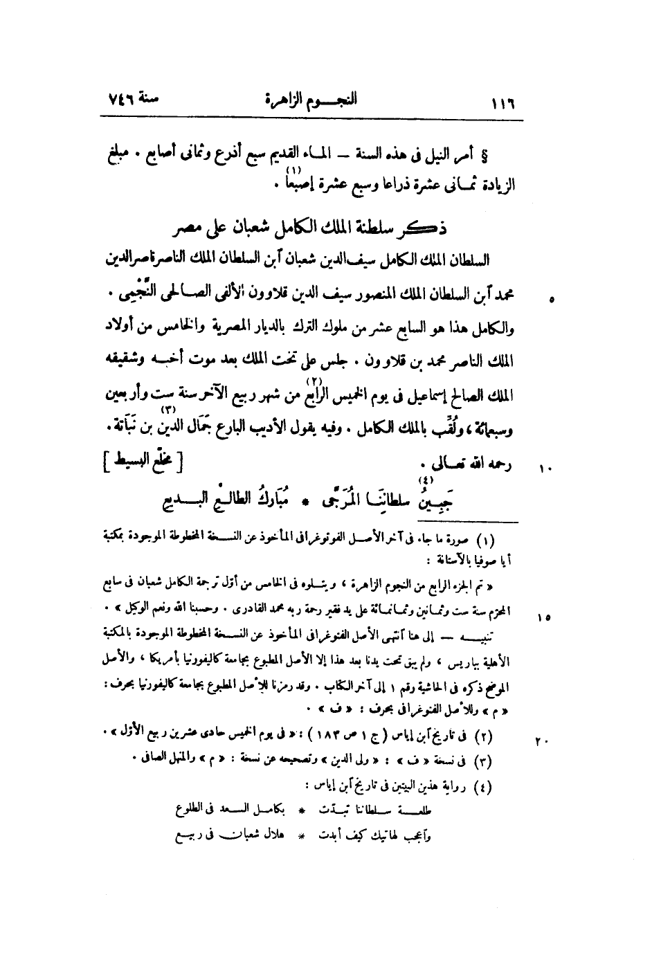 والكامل هذا هو السابع عشر من ملوك الترك بالديار المصرية والخامس من أولاد الملك الناصر محمد بن قلاوون. جلس على تخت الملك بعد موت أخيه وشقيقه الملك الصالح إسماعيل فى يوم الخميس الرابع «2» من شهر ربيع الآخر سنة ست وأربعين وسبعمائة، ولقّب بالملك الكامل. وفيه يقول الأديب البارع جمال الدين «3» بن نباتة.