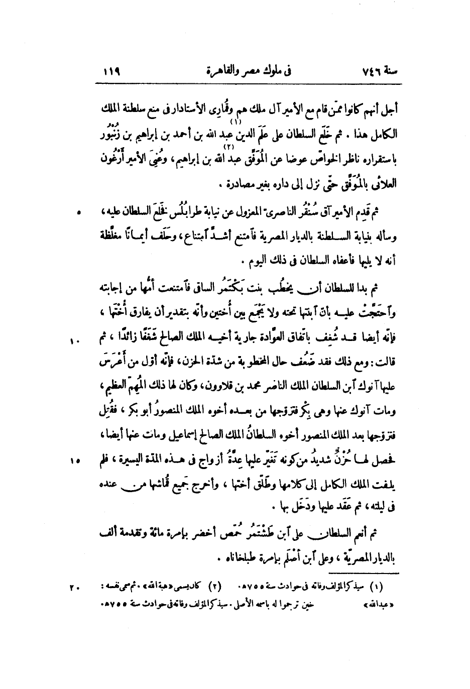 ثم بدا للسلطان أن يخطب بنت بكتمر الساقى فامتنعت أمّها من إجابته واحتجّت عليه بأنّ ابنتها تحته ولا يجمع بين أختين وأنّه بتقدير أن يفارق أختها، فإنّه أيضا قد شغف باتّفاق العوّادة جارية أخيه الملك الصالح شغفا زائدا، ثم قالت: ومع ذلك فقد ضعف حال المخطوبة من شدّة الحزن، فإنّه أوّل من أعرس عليها آنوك ابن السلطان الملك الناصر محمد بن قلاوون، وكان لها ذلك المهمّ العظيم، ومات آنوك عنها وهى بكر فتزوّجها من بعده أخوه الملك المنصور أبو بكر، فقتل فتزوّجها بعد الملك المنصور أخوه السلطان الملك الصالح إسماعيل ومات عنها أيضا، فحصل لها حزن شديد من كونه تغيّر عليها عدّة أزواج فى هذه المدّة اليسيرة، فلم يلفت الملك الكامل إلى كلامها وطلّق أختها، وأخرج جميع قماشها من عنده فى ليلته، ثم عقد عليها ودخل بها.