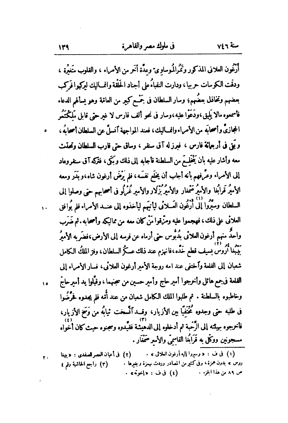 أرغون العلانى المذكور وتمر الموساوىّ وعدّة أخر من الأمراء، والقلوب متغيّرة، ودقّت الكوسات حربيا، ودارت النقباء على أجناد الحلقة والمماليك ليركبوا فركب بعضهم وتخاذل بعضهم؛ وسار السلطان فى جمع كبير من العامّة وهو يسألهم الدعاء فأسمعوه مالا يليق، ودعوا عليه، وسار فى نحو ألف فارس لا غير حتى قابل ملكتمر الحجازىّ وأصحابه من الأمراء والمماليك، فعند المواجهة انسلّ عن السلطان أصحابه، وبقى فى أربعمائة فارس، فبرز له آق سنقر، وساق حتى قارب السلطان وتحدّث معه وأشار عليه بأن ينخلع من السلطنة فأجابه إلى ذلك وبكى، فتركه آق سنقر وعاد إلى الأمراء وعرّفهم بأنه أجاب أن يخلع نفسه، فلم يرض أرغون شاه، وبدر ومعه الأمير قرابغا والأمير صمغار والأمير بزلار والأمير غرلو فى أصحابهم حتى وصلوا إلى السلطان وسيّروا إلى «1» أرغون العلائى ليأتيهم ليأخذوه إلى عند الأمراء فلم يوافق العلائى على ذلك، فهجموا عليه ومزّقوا من كان معه من مماليكه وأصحابه. ثم ضرب واحد منهم أرغون العلائى بدبّوس حتى أرماه عن فرسه إلى الأرض، فضربه الأمير بيبغا أروس «2» بسيف قطع خدّه، فانهزم عند ذلك عسكر السلطان، وفرّ الملك الكامل شعبان إلى القلعة واختفى عند امه روجة الأمير أرغون العلائى، فسار الأمراء إلى القلعة فى جمع هائل وأخرجوا أمير حاج وأمير حسين من سجنهما، وقبّلوا يد أمير حاجّ وخاطبوه بالسلطنة. ثم طلبوا الملك الكامل شعبان من عند أمّه فلم يجدوه فحرّضوا فى طلبه حتى وجدوه مختفيا بين الأزيار، وقد اتّسخت ثيابه من وسخ الأزيار، فأخرجوه بهيئته إلى الرّحبة ثم أدخلوه إلى الدهيشة «3» فقيّدوه وسجنوه حيث كان أخواه «4» مسجونين ووكّل به قرابغا القاسمىّ والأمير صمغار.