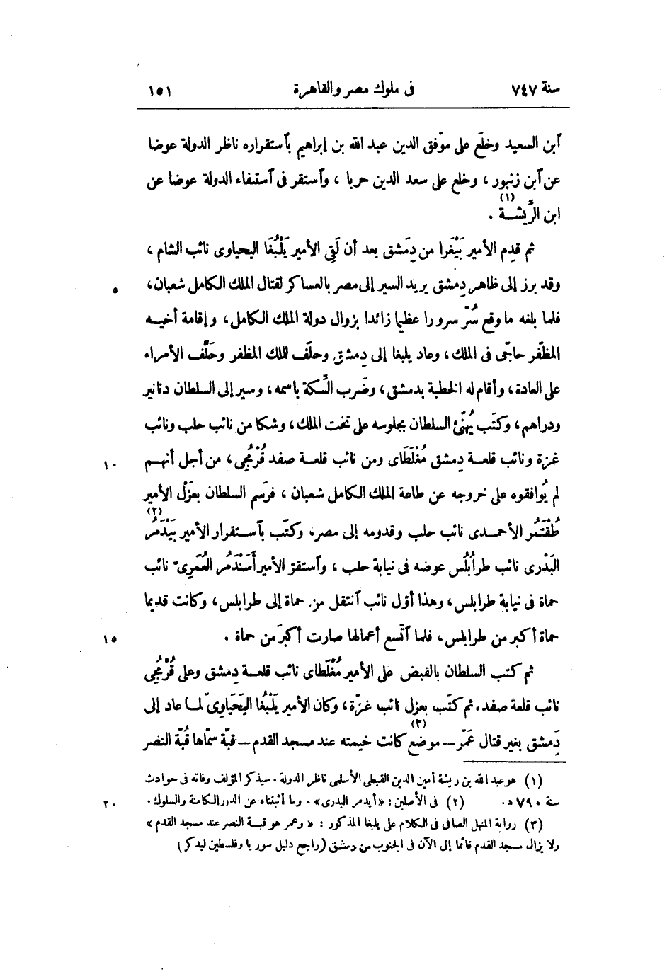 ثم كتب السلطان بالقبض على الأمير مغلطاى نائب قلعة دمشق وعلى قرمجى نائب قلعة صفد. ثم كتب بعزل نائب غزّة، وكان الأمير يلبغا اليحياوىّ لما عاد إلى دمشق بغير قتال عمّر- موضع «3» كانت خيمته عند مسجد القدم- قبّة سمّاها قبّة النصر