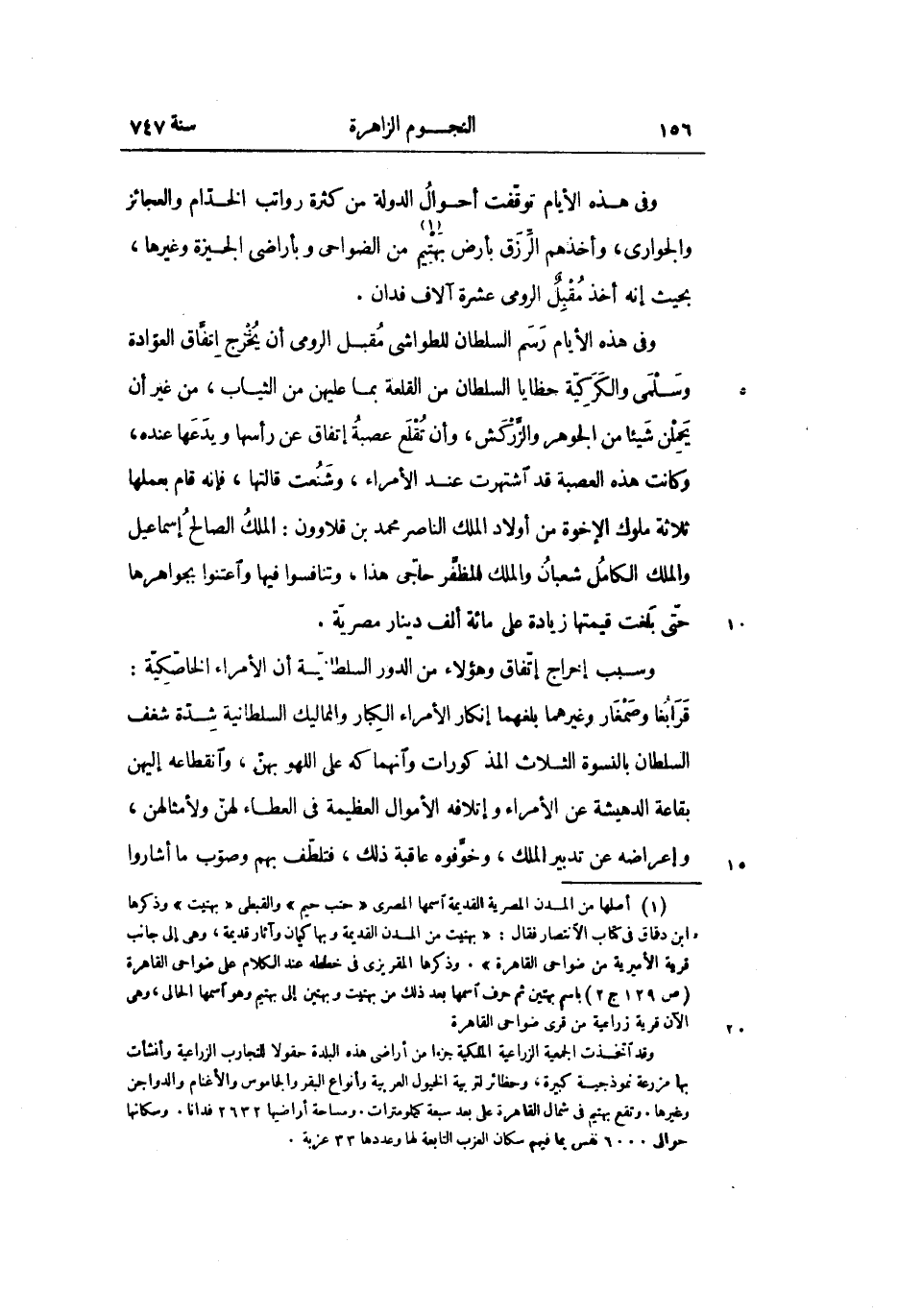 وفى هذه الأيام توقّفت أحوال الدولة من كثرة رواتب الخدّام والعجائز والجوارى، وأخذهم الرّزق بأرض بهتيم «1» من الضواحى وبأراضى الجيزة وغيرها، بحيث إنه أخذ مقبل الرومى عشرة آلاف فدان.