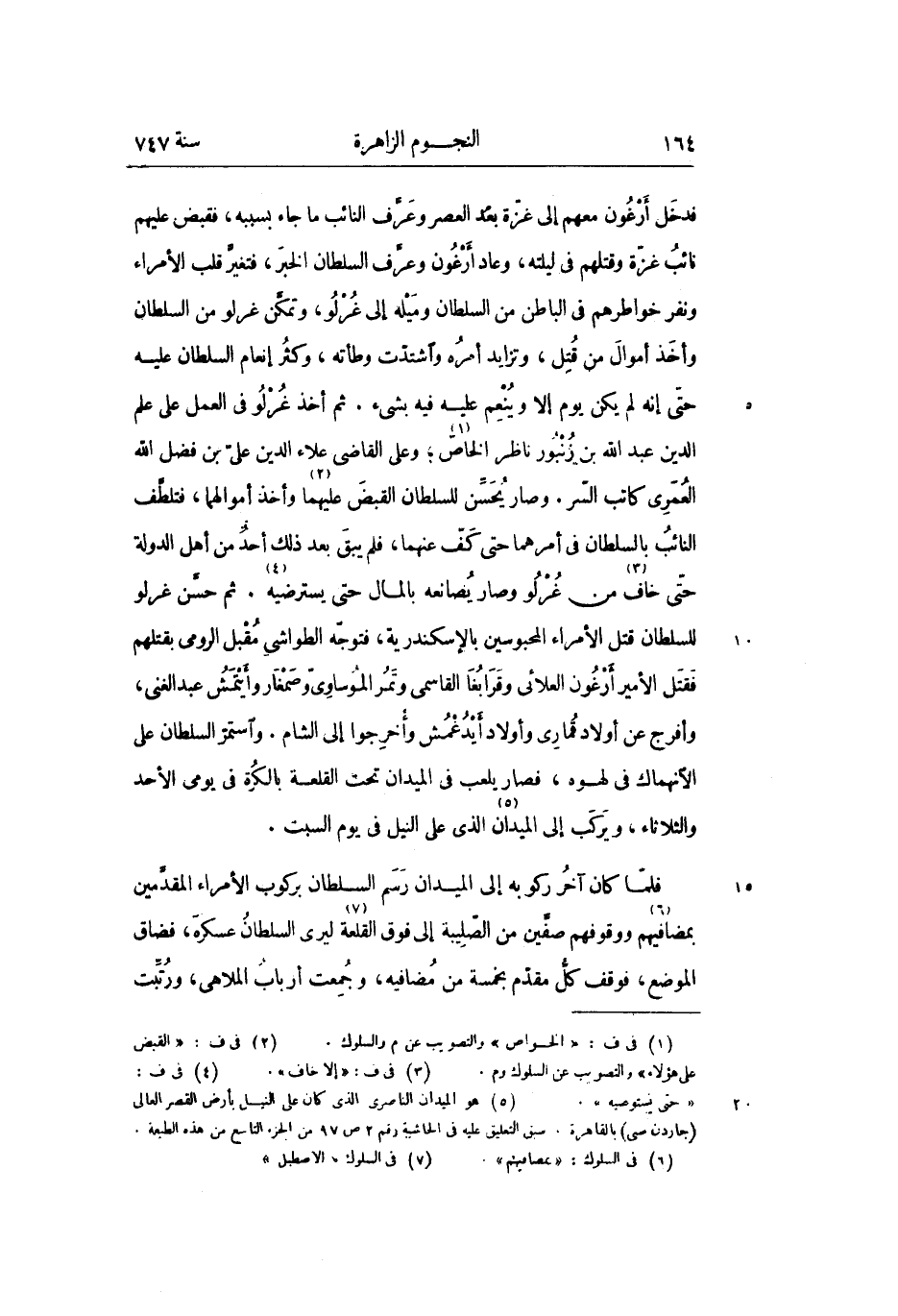 فدخل أرغون معهم إلى غزّة بعد العصر وعرّف النائب ما جاء بسببه، فقبض عليهم نائب غزّة وقتلهم فى ليلته، وعاد أرغون وعرّف السلطان الخبر، فتغيّر قلب الأمراء ونفر خواطرهم فى الباطن من السلطان وميله إلى غرلو، وتمكّن غرلو من السلطان وأخذ أموال من قتل، وتزايد أمره واشتدّت وطأته، وكثر إنعام السلطان عليه حتّى إنه لم يكن يوم إلا وينعم عليه فيه بشىء. ثم أخذ غرلو فى العمل على علم الدين عبد الله بن زنبور ناظر الخاصّ «1» ؛ وعلى القاضى علاء الدين علىّ بن فضل الله العمرى كاتب السّر. وصار يحسّن للسلطان القبض عليهما «2» وأخذ أموالهما، فتلطّف النائب بالسلطان فى أمرهما حتى كفّ عنهما، فلم يبق بعد ذلك أحد من أهل الدولة حتّى خاف «3» من غرلو وصار يصانعه بالمال حتى يسترضيه «4» . ثم حسّن غرلو للسلطان قتل الأمراء المحبوسين بالإسكندرية، فتوجّه الطواشى مقبل الرومى بقتلهم فقتل الأمير أرغون العلائى وقرابغا القاسمى وتمر الموساوىّ وصمغار وأيتمش عبد الغنى، وأفرج عن أولاد قمارى وأولاد أيدغمش وأخرجوا إلى الشام. واستمرّ السلطان على الانهماك فى لهوه، فصار يلعب فى الميدان تحت القلعة بالكرة فى يومى الأحد والثلاثاء، ويركب إلى الميدان «5» الذي على النيل فى يوم السبت.