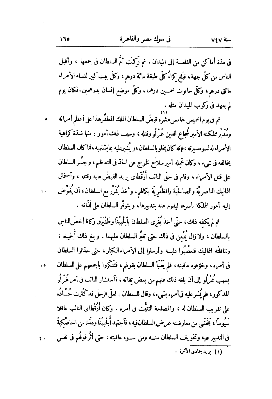 ثم فى يوم الخميس خامس عشره «1» قبض السلطان الملك المظفّر هذا على أعظم أمرائه ومدبّر مملكته الأمير شجاع الدين غرلو وقتله، وسبب ذلك أمور: منها شدّة كراهية الأمراء له لسوء سيرته، فإنه كان يخلو بالسلطان، ويشير عليه بما يشتهيه، فما كان السلطان يخالفه فى شىء، وكان عمله أمير سلاح فخرج عن الحدّ فى التعاظم، وجسّر السلطان على قتل الأمراء، وقام فى حقّ النائب أرقطاى يريد القبض عليه وقتله، واستمال المماليك الناصريّة والصالحيّة والمظفّريّة بكمالهم، وأخذ يقرّر مع السلطان، أن يفوّض إليه أمور المملكة بأسرها ليقوم عنه بتدبيرها، ويتوفّر السلطان على لذاته.