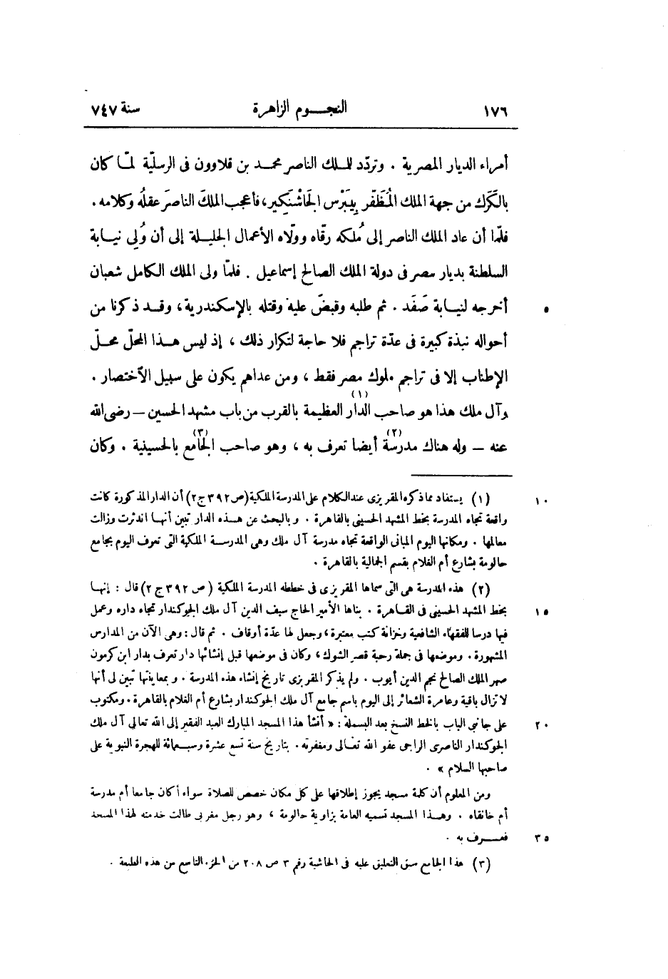 وآل ملك هذا هو صاحب الدار «1» العظيمة بالقرب من باب مشهد الحسين- رضى الله عنه- وله هناك مدرسة «2» أيضا تعرف به، وهو صاحب الجامع «3» بالحسينية. وكان