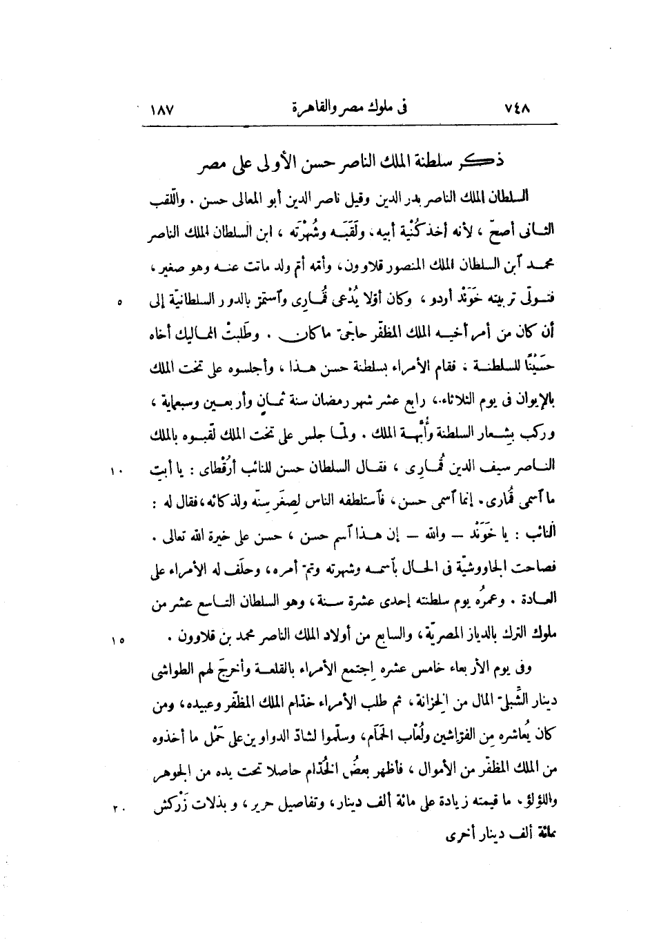 السلطان الملك الناصر بدر الدين وقيل ناصر الدين أبو المعالى حسن. واللّقب الثانى أصحّ، لأنه أخذ كنية أبيه، ولقبه وشهرته، ابن السلطان الملك الناصر محمد ابن السلطان الملك المنصور قلاوون، وأمّه أمّ ولد ماتت عنه وهو صغير، فتولّى تربيته خوند أردو، وكان أوّلا يدعى قمارى واستمرّ بالدور السلطانيّة إلى أن كان من أمر أخيه الملك المظفّر حاجّىّ ما كان. وطلبت المماليك أخاه حسينا للسلطنة، فقام الأمراء بسلطنة حسن هذا، وأجلسوه على تخت الملك بالإيوان فى يوم الثلاثاء، رابع عشر شهر رمضان سنة ثمان وأربعين وسبعماية، وركب بشعار السلطنة وأبّهة الملك. ولمّا جلس على تخت الملك لقّبوه بالملك الناصر سيف الدين قمارى، فقال السلطان حسن للنائب أرقطاى: يا أبت ما اسمى قمارى، إنما اسمى حسن، فاستلطفه الناس لصغر سنّه ولذكائه، فقال له: